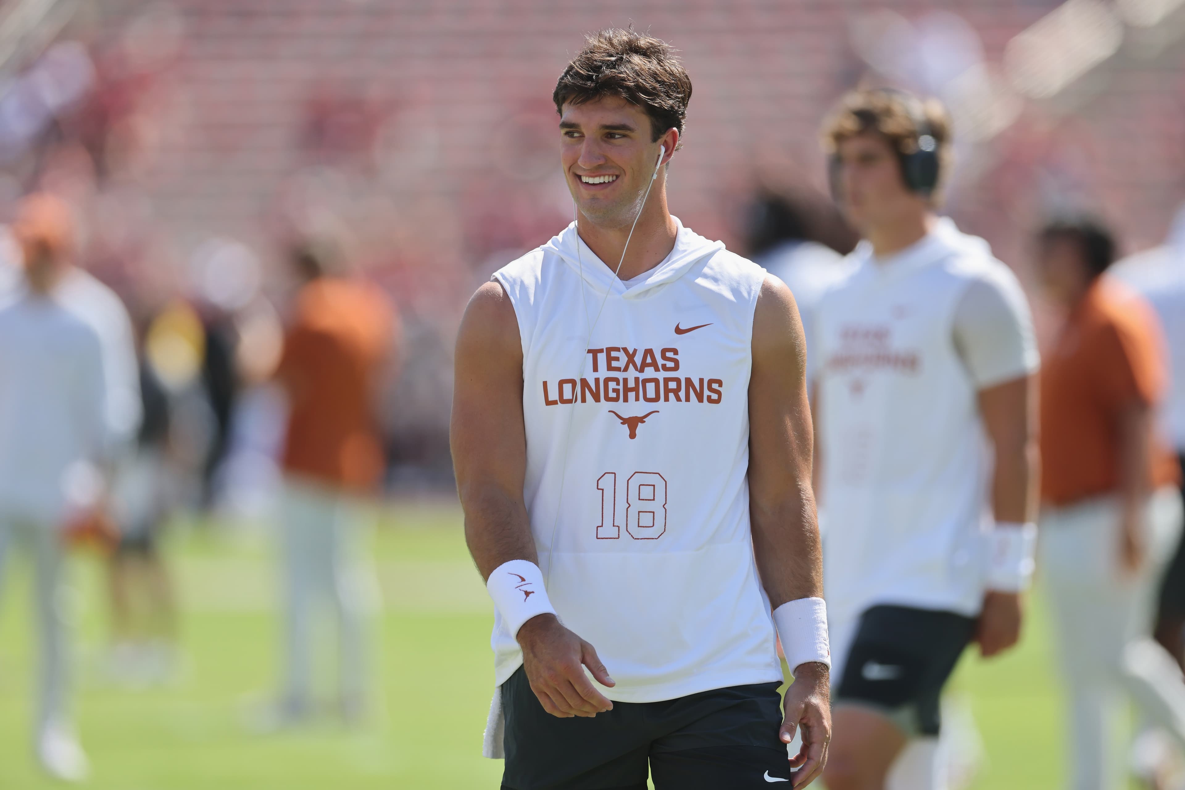 DALLAS, TEXAS - OCTOBER 11: Matthew Caldwell #18 of the Texas Longhorns warms up before the game against the Oklahoma Sooners at Cotton Bowl on October 11, 2025 in Dallas, Texas. (Photo by Tim Warner/Getty Images) | Getty Images