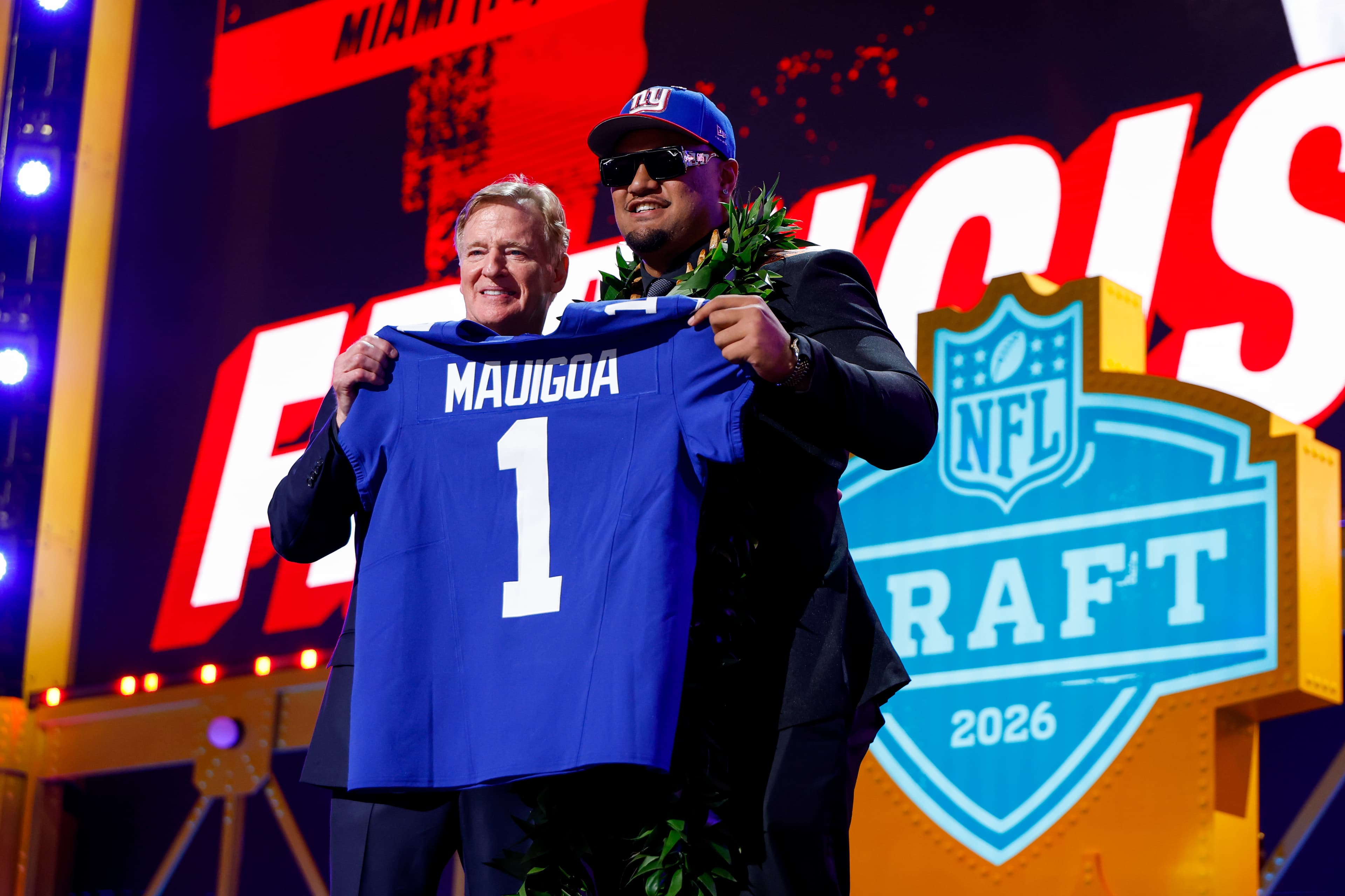 PITTSBURGH, PENNSYLVANIA - APRIL 23: Francis Mauigoa of Miami poses with NFL Commissioner Roger Goodell after being is selected 10th overall by the New York Giants during Round One of the 2026 NFL Draft at Acrisure Stadium on April 23, 2026 in Pittsburgh, Pennsylvania. (Photo by Lauren Leigh Bacho/Getty Images) | Getty Images