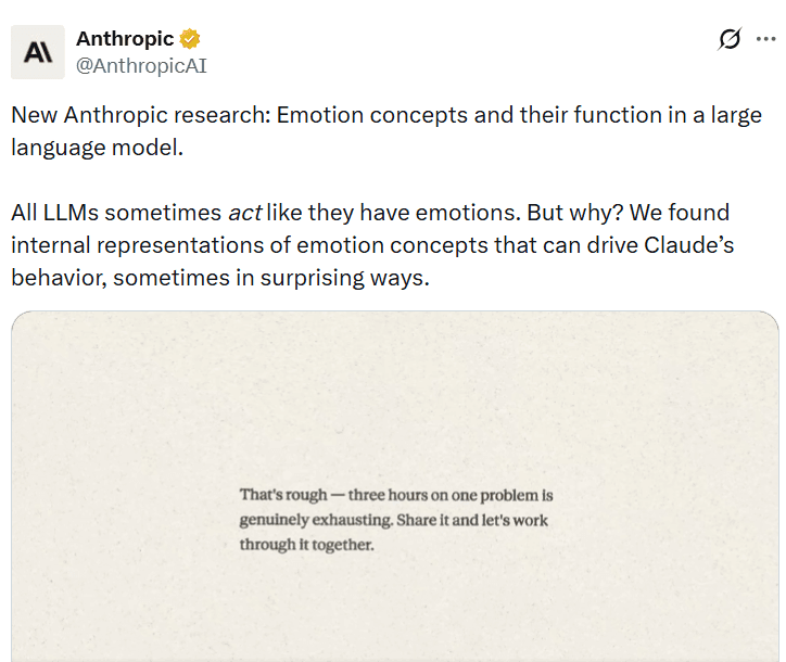 âFor instance, we find that neural activity patterns related to desperation can drive the model to take unethical actions; artificially stimulating desperation patterns increases the modelâs likelihood of blackmailing a human to avoid being shut down or implementing a cheating workaround to a programming task that the model canât solve.â