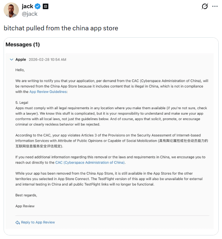 In an X post on Sunday, Dorsey shared a screenshot from Apple’s app review team informing him that Bitchat had been removed from the App Store in February and that the TestFlight beta version would no longer be available in China at the request of the Cyberspace Administration of China (CAC).