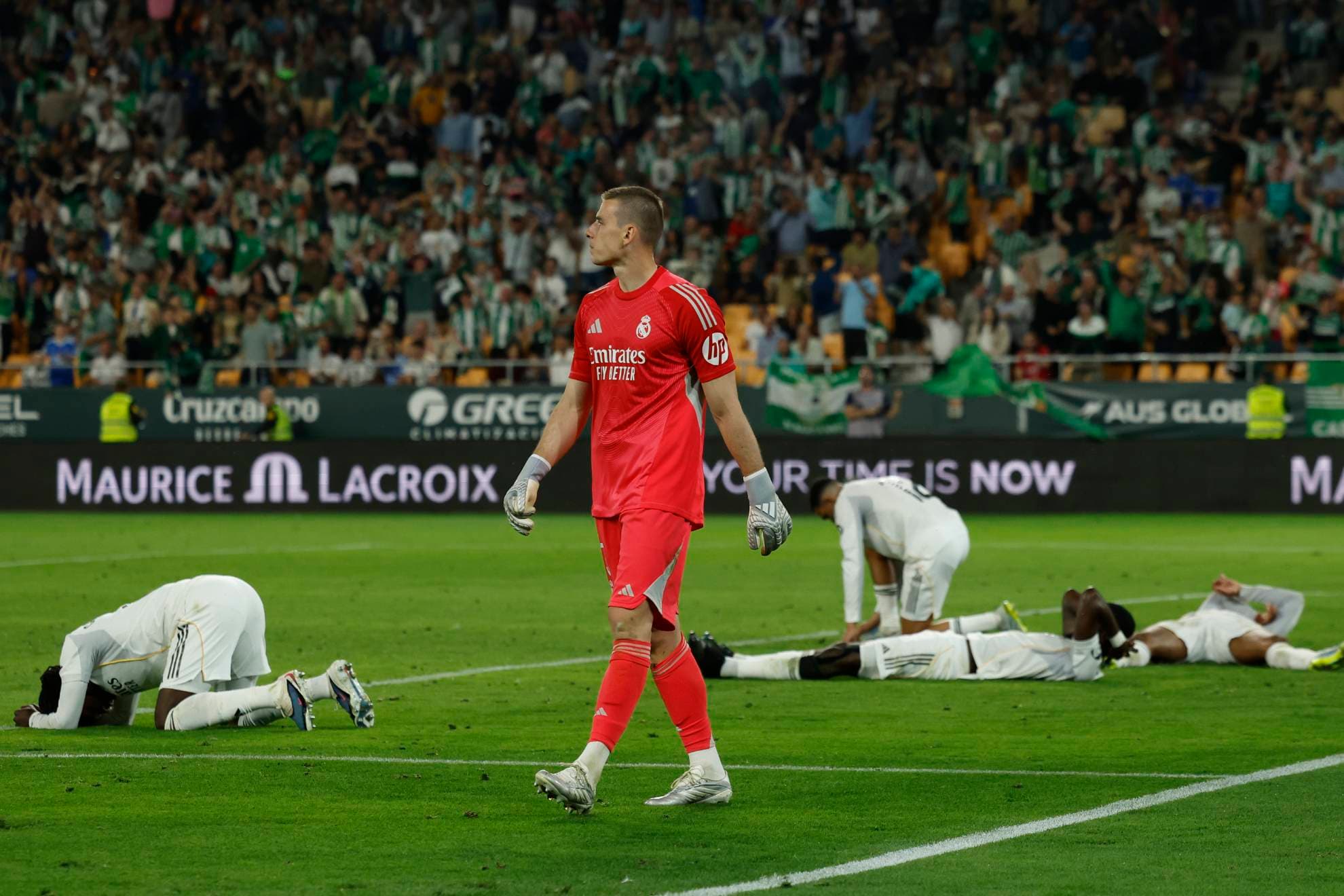 Lunin camina con varios de sus compañeros tirados tras el empate del Betis.