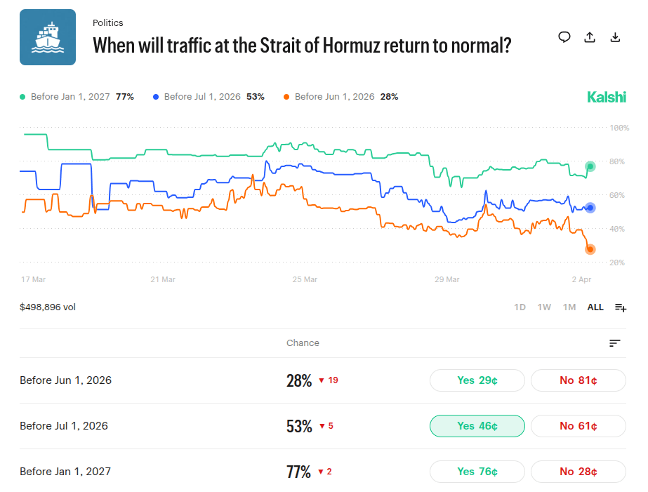 Prediction platform Kalshi showed declining odds of oil traffic reverting to ânormalâ levels this year.