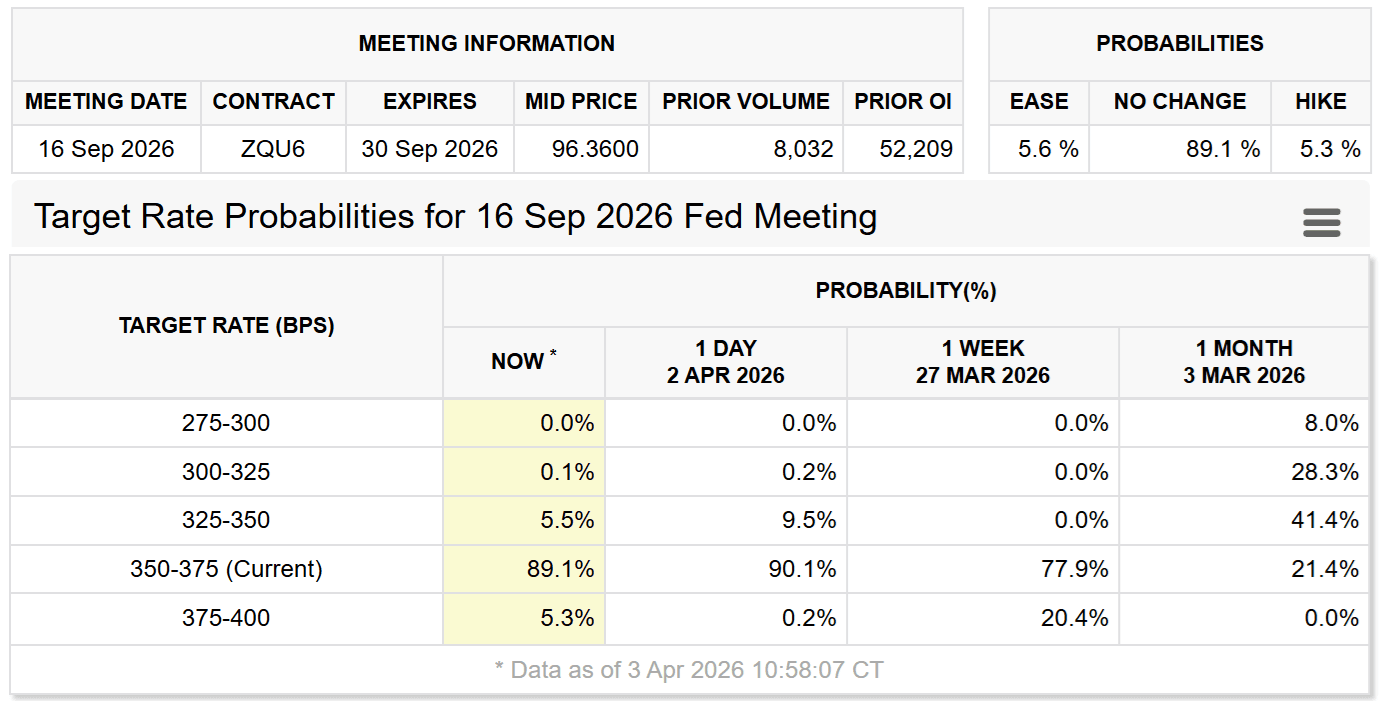 Traders are pricing in 89% odds that the Fed will keep interest rates steady through September, with 5% odds of a hike to 4%.