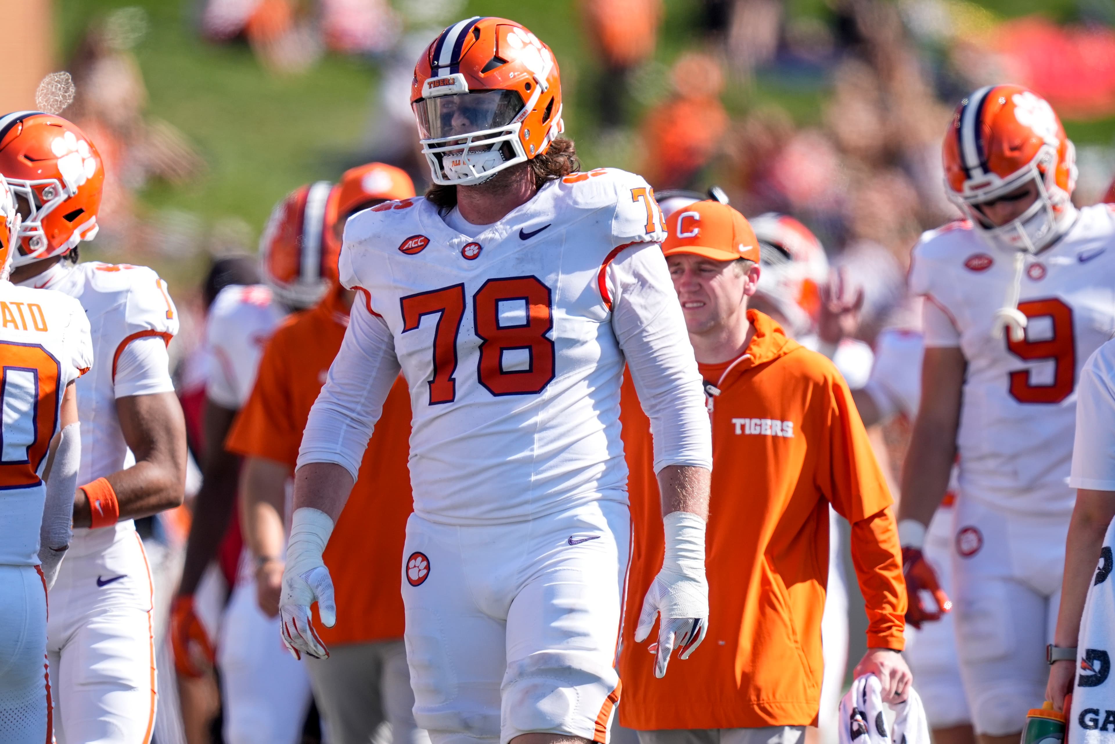 Oct 12, 2024; Winston-Salem, North Carolina, USA; Clemson Tigers offensive lineman Blake Miller (78) during the second half against the Wake Forest Demon Deacons at Allegacy Federal Credit Union Stadium. Mandatory Credit: Jim Dedmon-Imagn Images | Jim Dedmon-Imagn Images