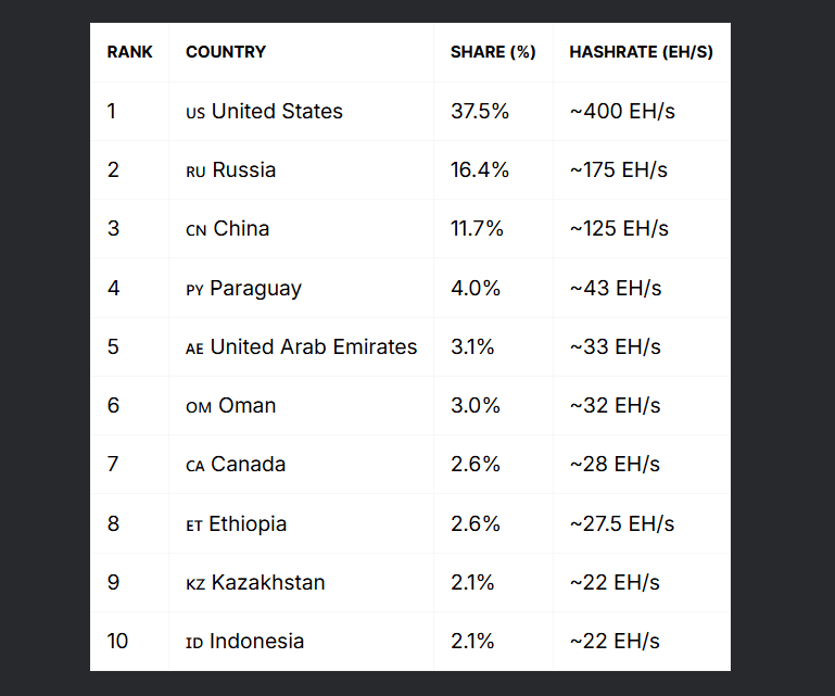 Top Bitcoin mining countries by hashrate. Source: Compass Mining