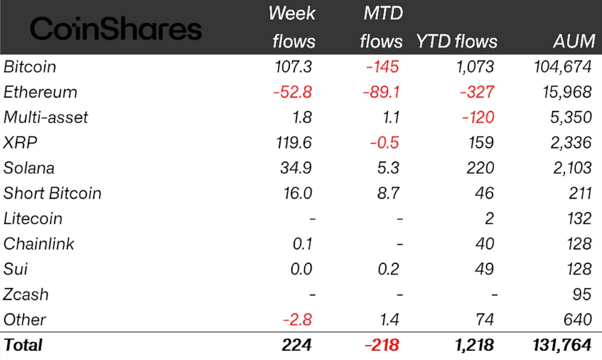 Global crypto exchange-traded products (ETPs) clocked $224 million in inflows last week, following a $414 million outflow a week before, CoinShares reported on Tuesday.