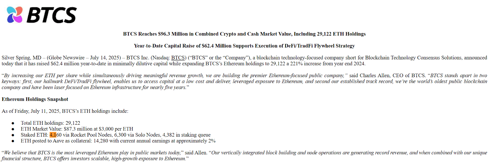 BTCS Inc., the 10th-largest Ether treasury company by returns, has also staked a part of its Ether holdings through the liquid staking protocol Rocket Pool. Out of its total 29,122 ETH holdings, the company has liquid staked 4,160 ETH ($8.8 million) through Rocket Pool nodes, according to a July 2025 SEC filing.