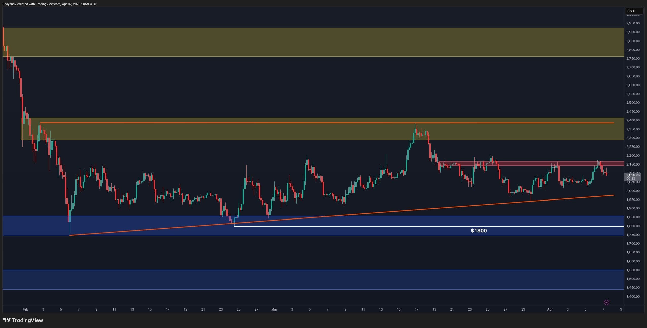 The price is currently trading around $2.1k. It has repeatedly tested the $2.2k short-term resistance zone formed with recent 4-hour timeframe highs, but has failed to break through it with conviction. With the lower trendline of the triangle also converging from below, the structure suggests compression, and a breakout is becoming increasingly likely.