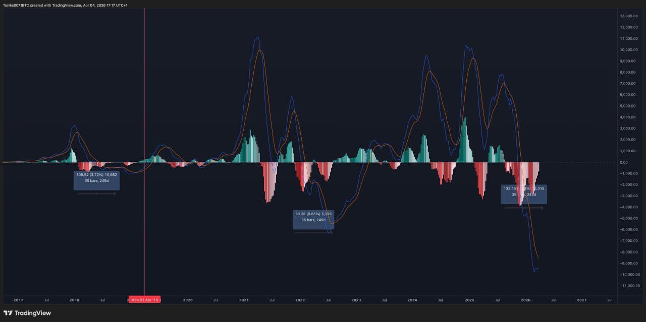 Bitcoinâs last bullish weekly MACD flip occurred in May 2025, around one month after BTC/USD put in its 2025 low near $74,500. Over the following two months, price went from $94,000 to $119,000, setting new all-time highs.