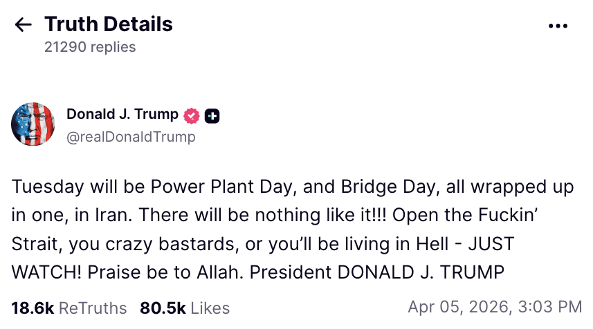 In a post on Truth Social at the weekend, Trump appeared particularly impatient, calling the day of the deadline âPower Plant Dayâ and "Bridge Dayâ while demanding that Hormuz reopen.
