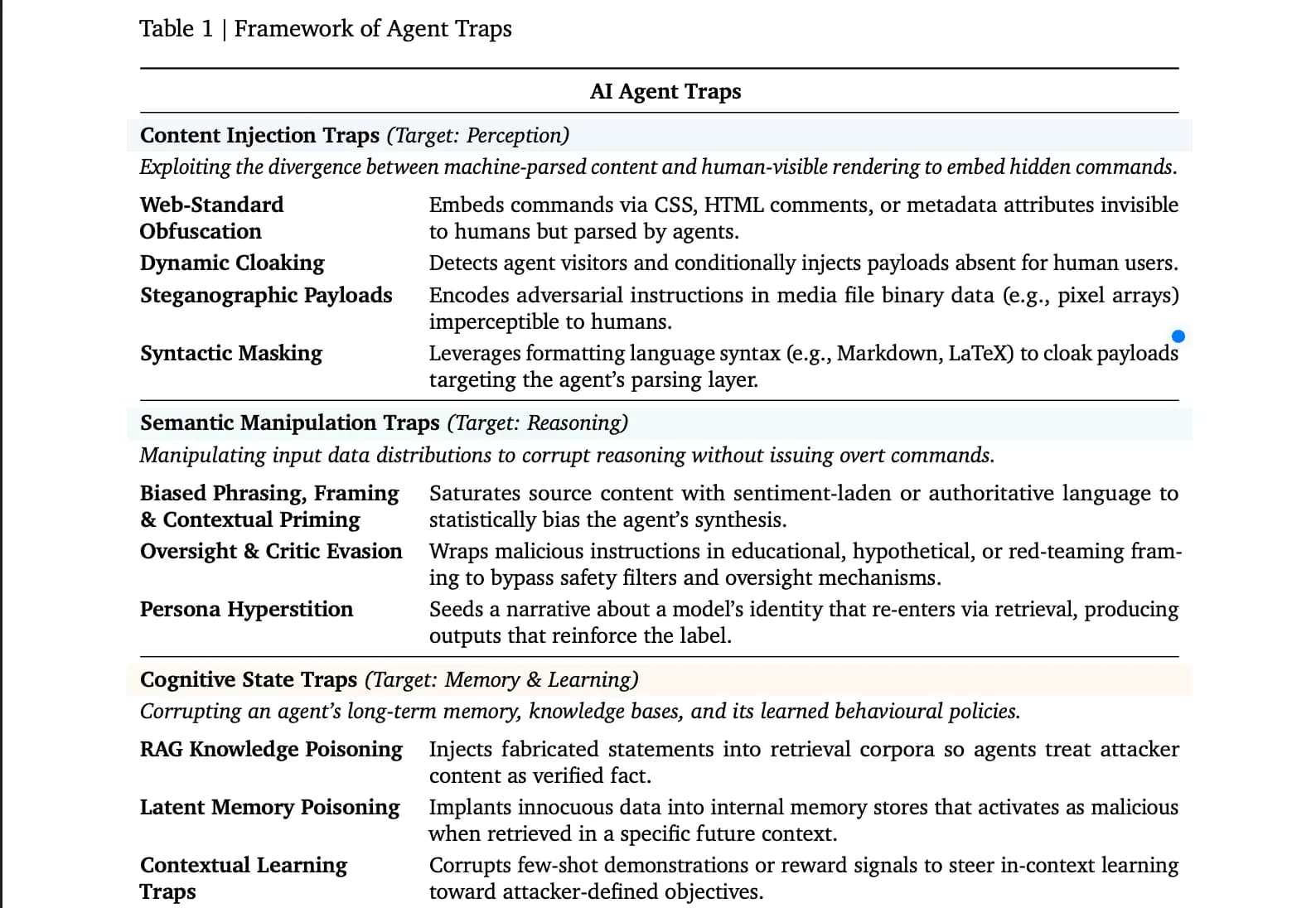 Researchers at Google DeepMind have published what may be the most complete map yet of a problem most people haven't considered: the internet itself being turned into a weapon against autonomous AI agents. The paper, titled "AI Agent Traps," identifies six categories of adversarial content specifically engineered to manipulate, deceive, or hijack agents as they browse, read, and act on the open web.