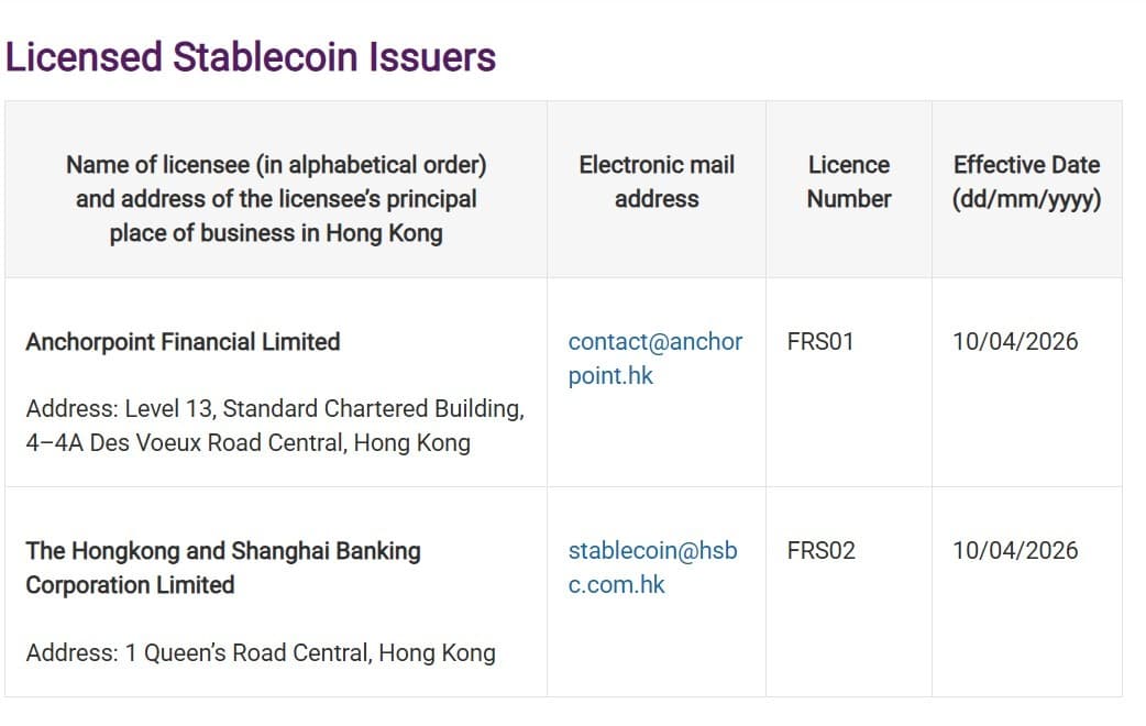 Hong Kong has granted its first stablecoin issuer licenses to Anchorpoint Financial and HSBC under a new regulatory framework by the Hong Kong Monetary Authority. This marks a significant step in the city's stablecoin licensing process.