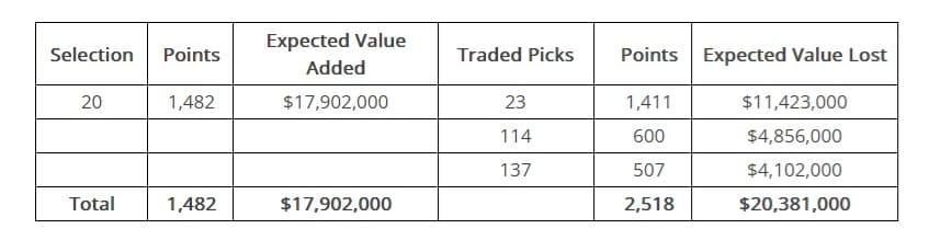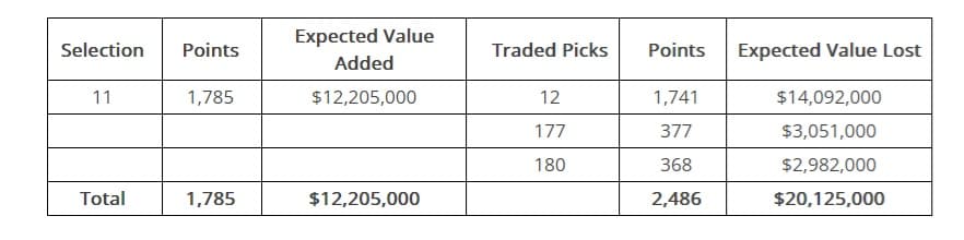 A steal for Miami who land a more premier position (the value is actually higher than shown since we value the trade down as “blind” and this wasn’t) and a reasonable chance for two contributors later in the draft. Similar to the Bills trade above, just because it isn’t as good as some past trades in a similar spot it was far better than just sitting pat because the deal wasn’t good enough.