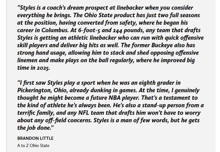 At 6-foot-5, 244 pounds, Styles is one of the most athletic linebacker prospects in NFL history. That sounds like hyperbole, but RAS, which takes combine measurements pre-draft and ranks prospects athletically based on those numbers rated Styles a 9.99 out of 10. For some perspective on just how athletic he is, out of the 3460 linebacker prospects from 1987 to 2026, RAS ranked Styles as the fourth best athlete.