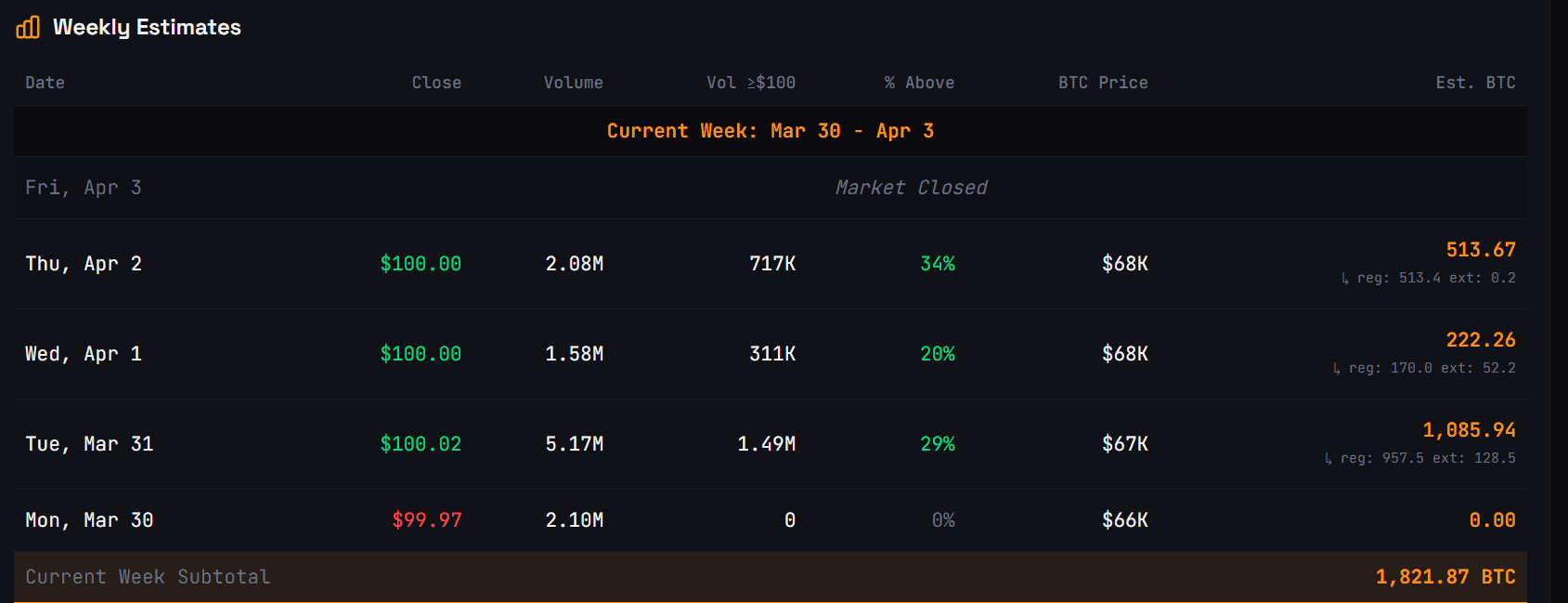 According to estimates from STRC.LIVE, Strategy could be set for a purchase of at least 1,821 BTC based on funds raised for the week ending April 3.