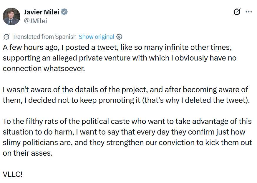 In February 2025, Milei made a post on X promoting the Libra token as a way to grow Argentina’s economy by funding small businesses and startups.