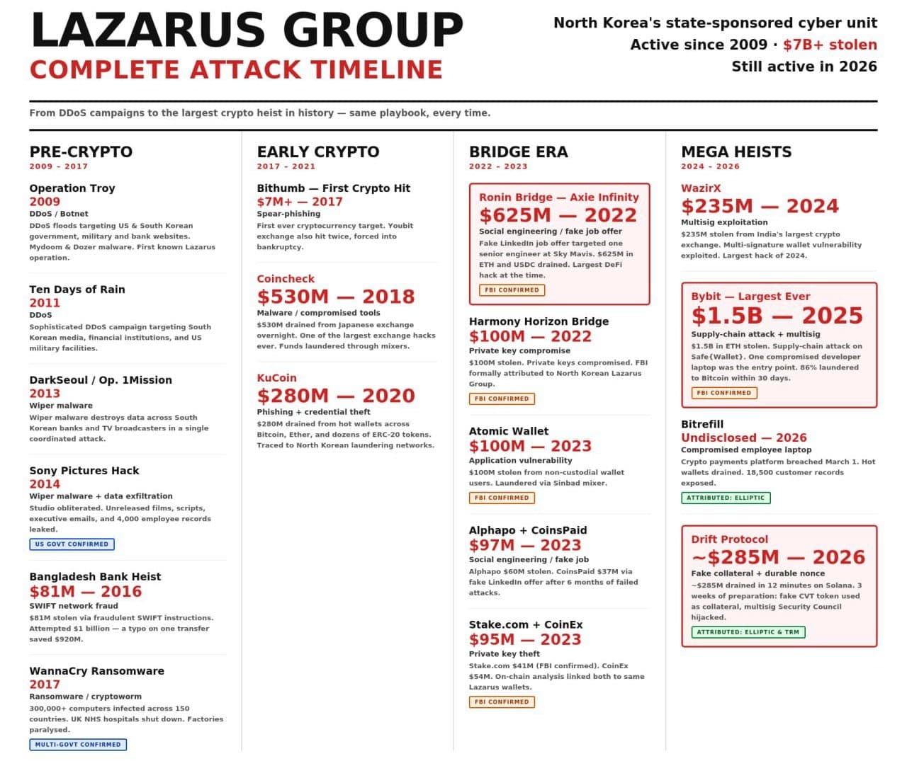 It has been linked to the industry’s highest-profile hacks, including the $625 million Ronin Bridge exploit in 2022, the $235 million WazirX hack in 2024 and the $1.4 billion Bybit heist in 2025.