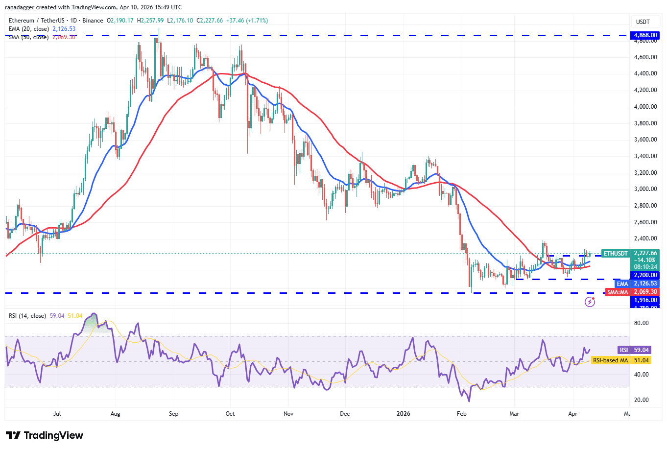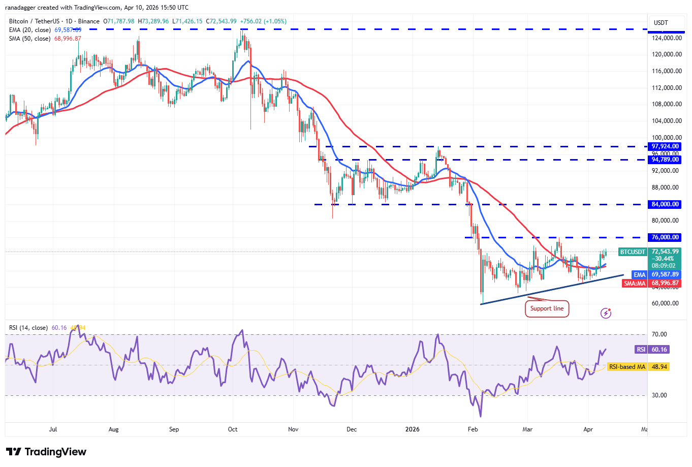 A positive in favor of the bulls is that the 20-day exponential moving average ($69,587) has started to turn up, and the relative strength index (RSI) has risen into the positive territory. That increases the possibility of a rally to the $76,000 resistance.