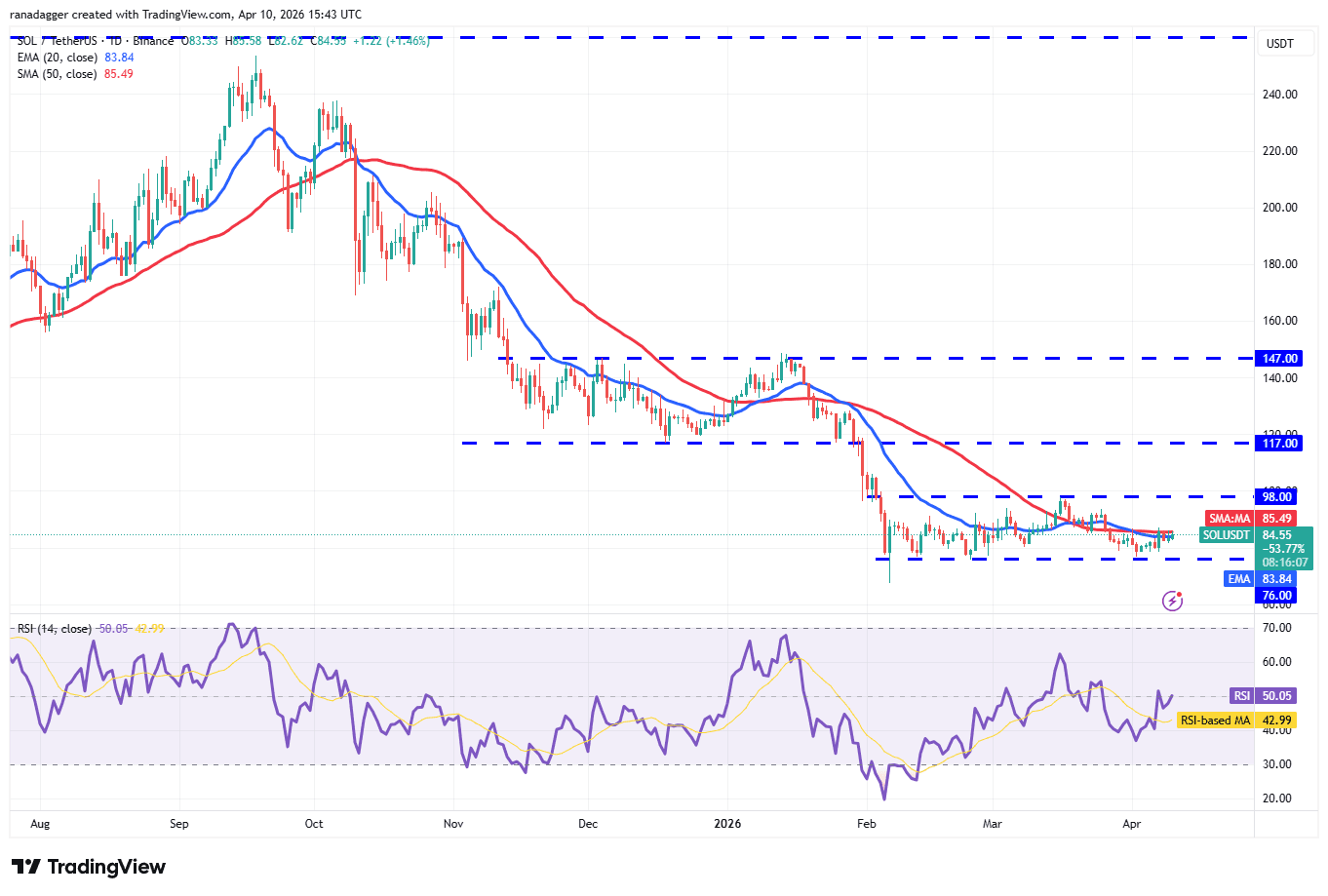 Solana (SOL) has been consolidating inside the $76 to $98 range, signaling buying on dips and selling on rallies.