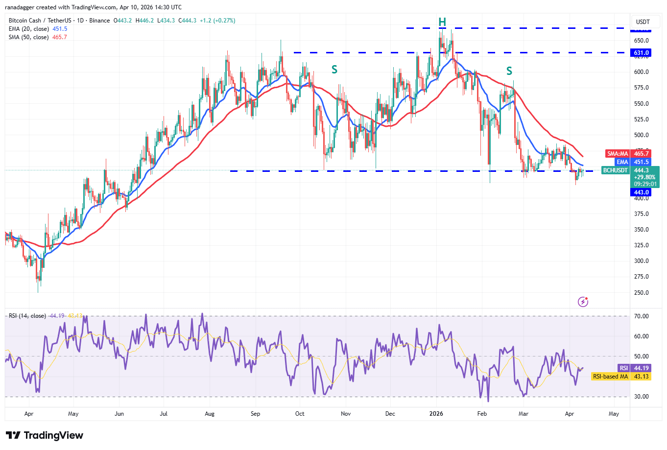 That increases the likelihood of a break above the 20-day EMA. If that happens, the BCH/USDT pair may climb to the 50-day SMA ($465) and subsequently to the $486 resistance. A close above the $486 level suggests that the market has rejected the break below the $443 support.