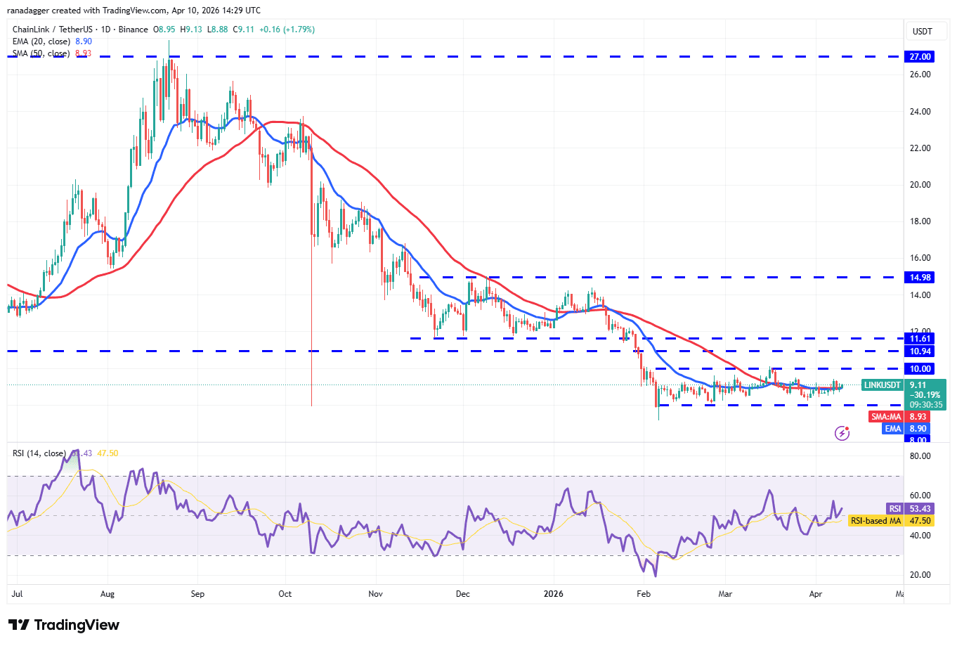 Chainlink (LINK) has been stuck between the $8 and $10 level for several days, indicating a balance between supply and demand.