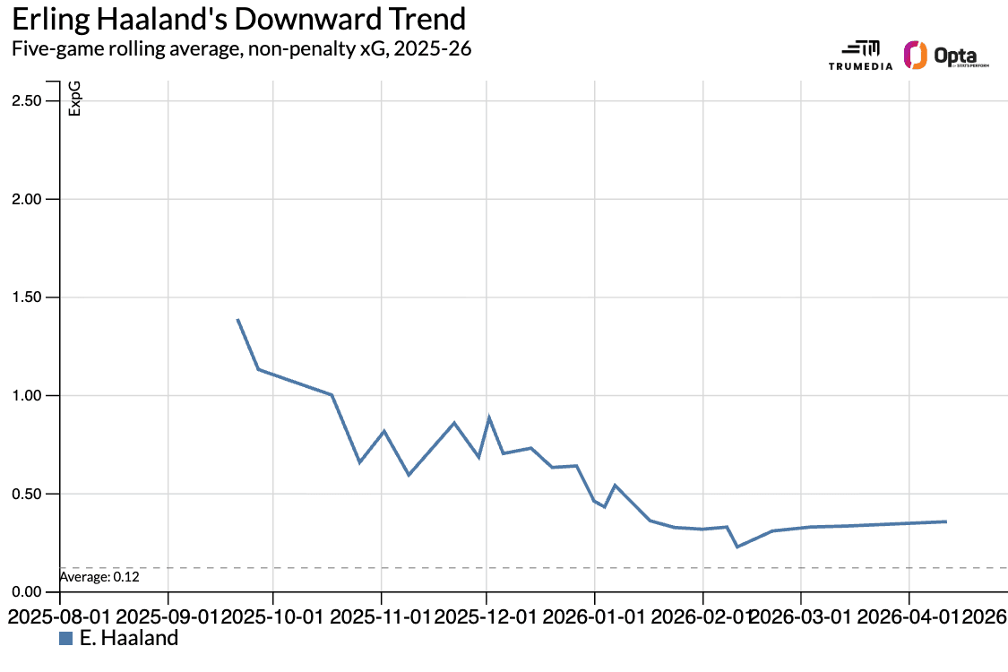 That's how it looks when you compare the non-penalty xG for each five-game bucket of his season: Games One to Five, Two to Six and on and on. He has been a below 0.5 xG player for all of 2026. He's averaging 0.72 xG per game for his City career.