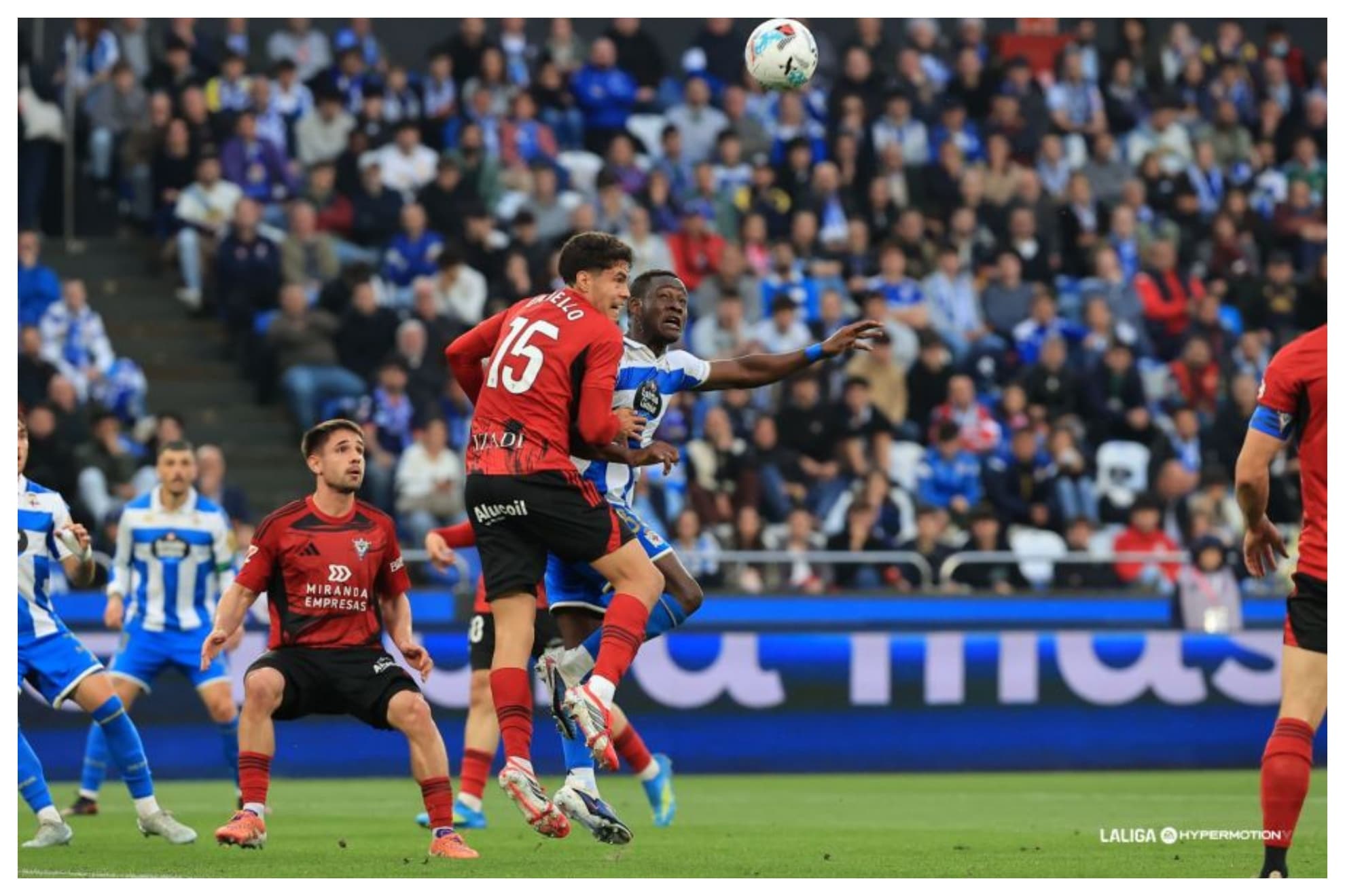 Nsongo, autor del tercer gol del Dépor, y Cabello disputan un balón aéreo en RiazorLALIGA