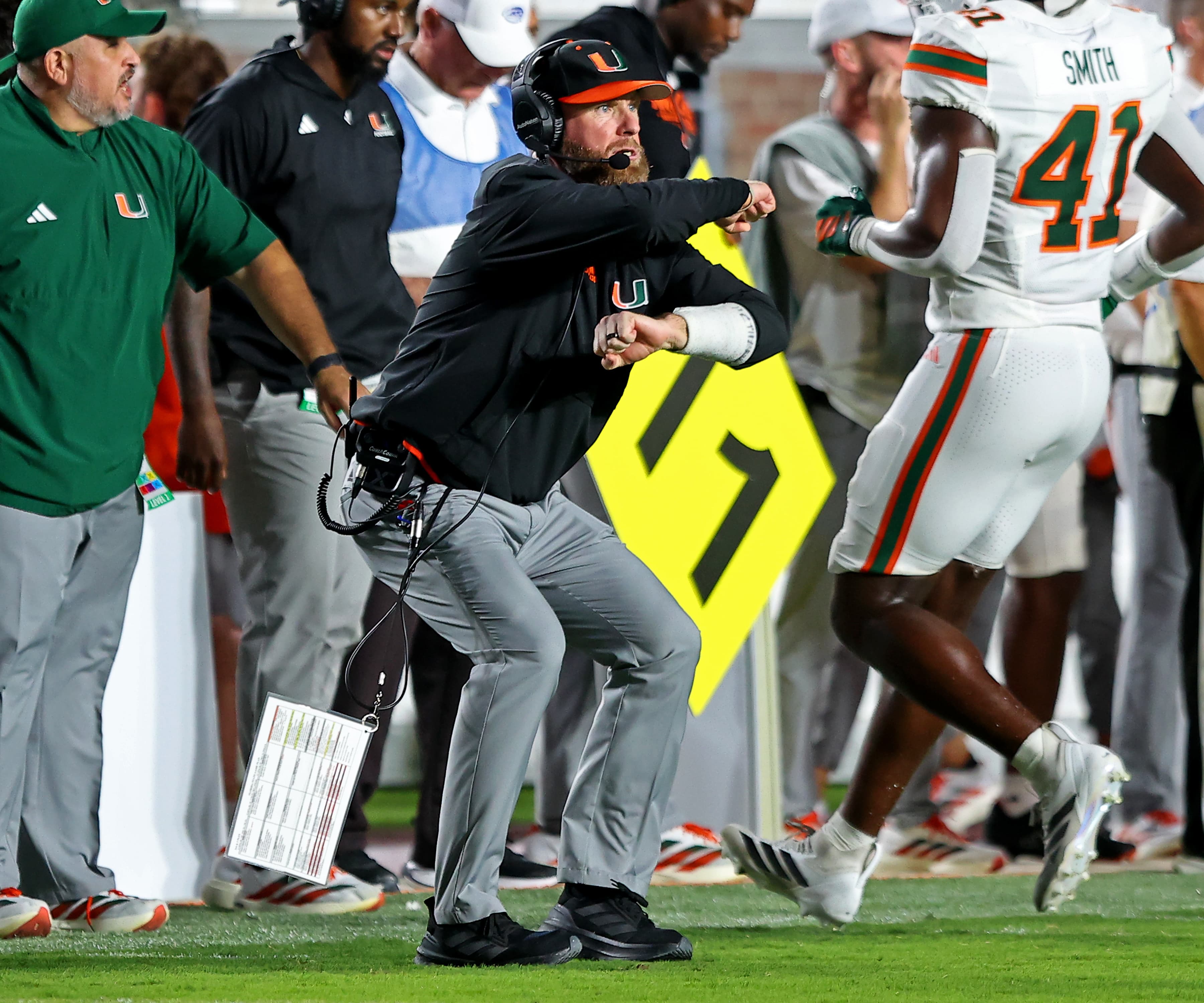 TALLAHASSEE, FLORIDA - OCTOBER 4: Miami Hurricanes defensive coordinator Corey Hetherman calls a defensive play in the second half of the game against the Florida State Seminoles at Doak S. Campbell Stadium on October 4, 2025 in Tallahassee, Florida. (Photo by Jason Clark/Getty Images) | Getty Images