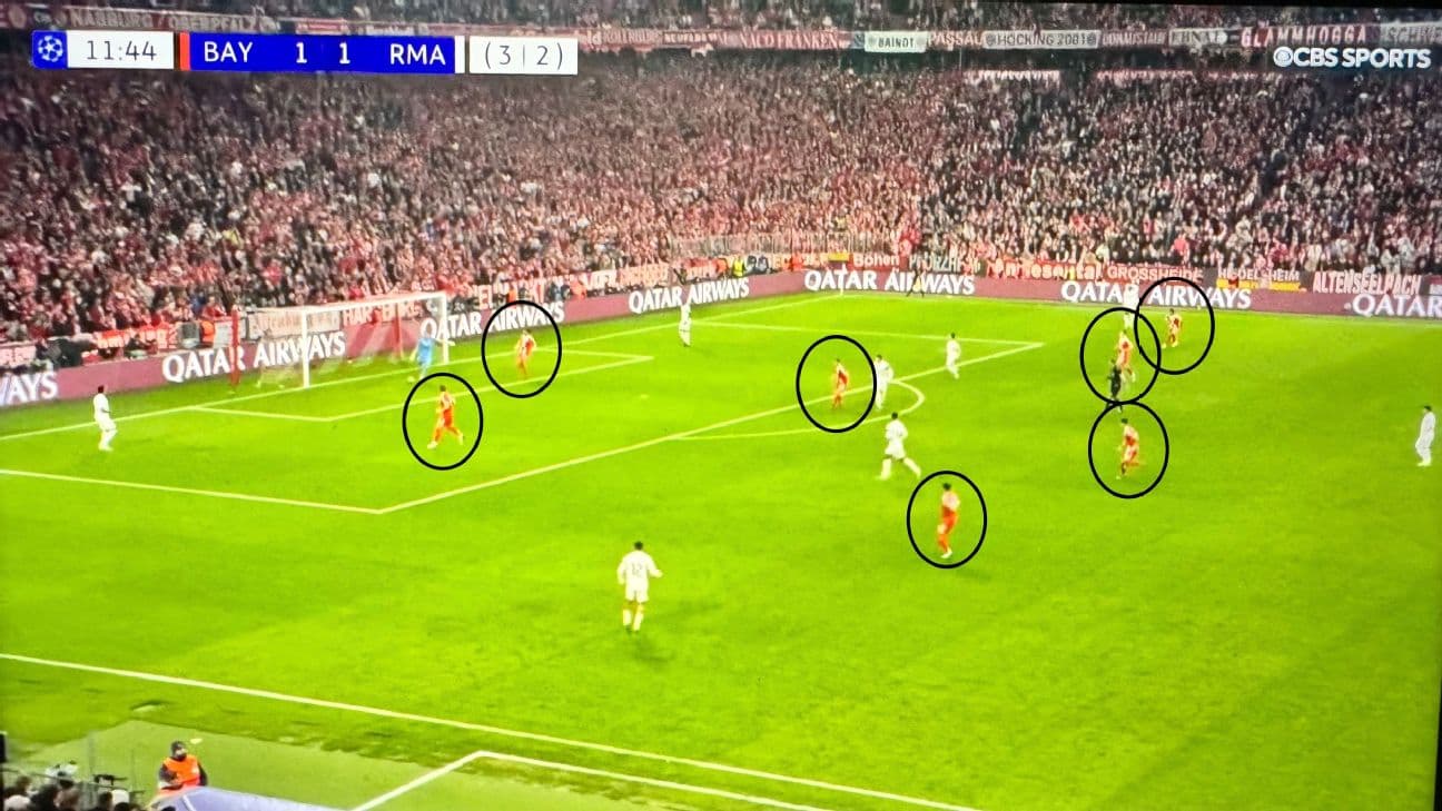 That's seven Bayern players pressing in the attacking third as Real Madrid -- a team featuring Kylian Mbappé, maybe the scariest attacker in the world in space, and Vinícius Júnior, the 2024 Ballon d'Or runner up -- attempted to build play from the back. Instead of forcing Real Madrid to create a goal in crowded areas after taking a 2-1 lead home from last week's match in Madrid, Vincent Kompany wanted Bayern to play to their strength, pinning Real Madrid at the wrong end of the pitch and wagering that this high-wire act would create as many goals as it allowed.