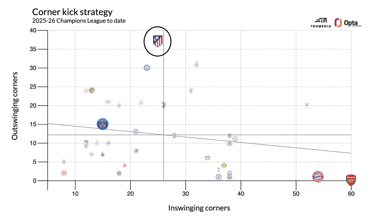 Atletico have proven capable of earning opportunities in a variety of ways. It goes without saying that a Simeone team can counterattack well, but Alvarez scored on an absurdly pretty free kick in the first leg of the quarterfinals, and no semifinalist -- not even Set Piece FC -- is more dangerous on corner kicks: They've scored on 10.4% of their corners in the Champions League, third overall (behind lower-sample-size Pafos and Club Brugge) and far more than Bayern (5.7%), PSG (5.0%) or Arsenal (4.4%). They vary their strategies on corners to great effect, too: Whereas 54% of Champions League corners have been inswinging and 25% have been outswinging, Atleti's percentages are 32% and 48%, respectively.