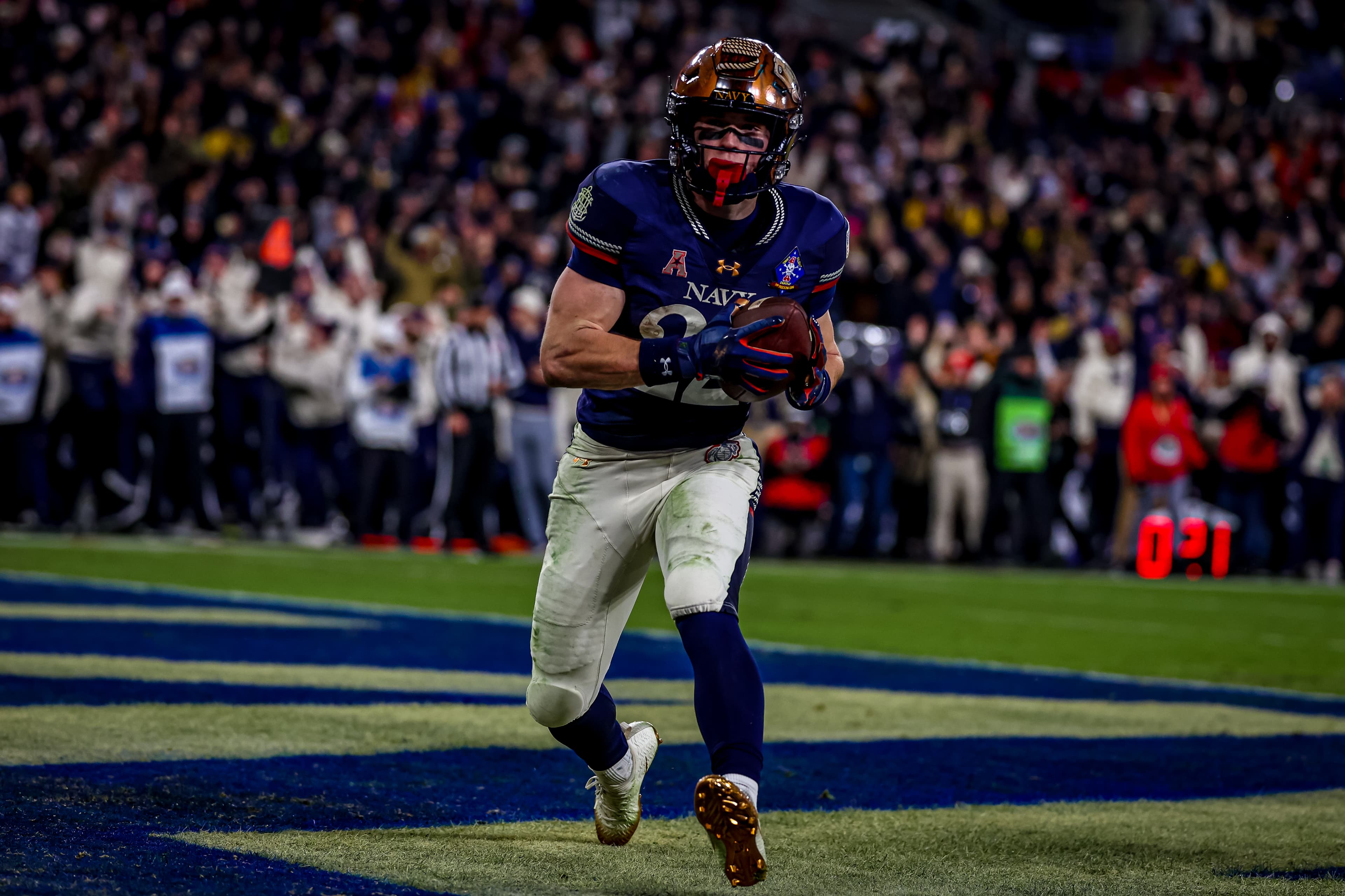 Navy's Eli Heidenreich is one of the most fascinating prospects in this class, because his toolkit is soooo unique. Sweep runner, zone big-play guy in the backfield, insert blocker, and can create explosives as an outside receiver. McVay/Shanahan/Kubiak would have field days. pic.twitter.com/QXOrbRNch9