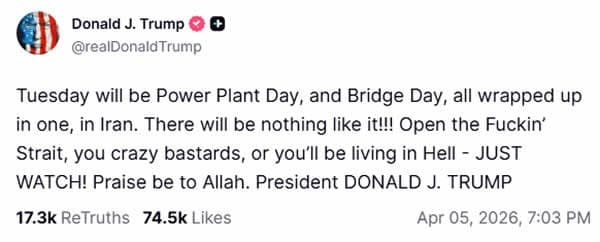 Trump initially gave Iran a 10-day window to reopen the Strait of Hormuz, but his latest post suggests that Iran now has until Tuesday to reopen the waterway, or the US would attack Iranâs power plants and bridges.