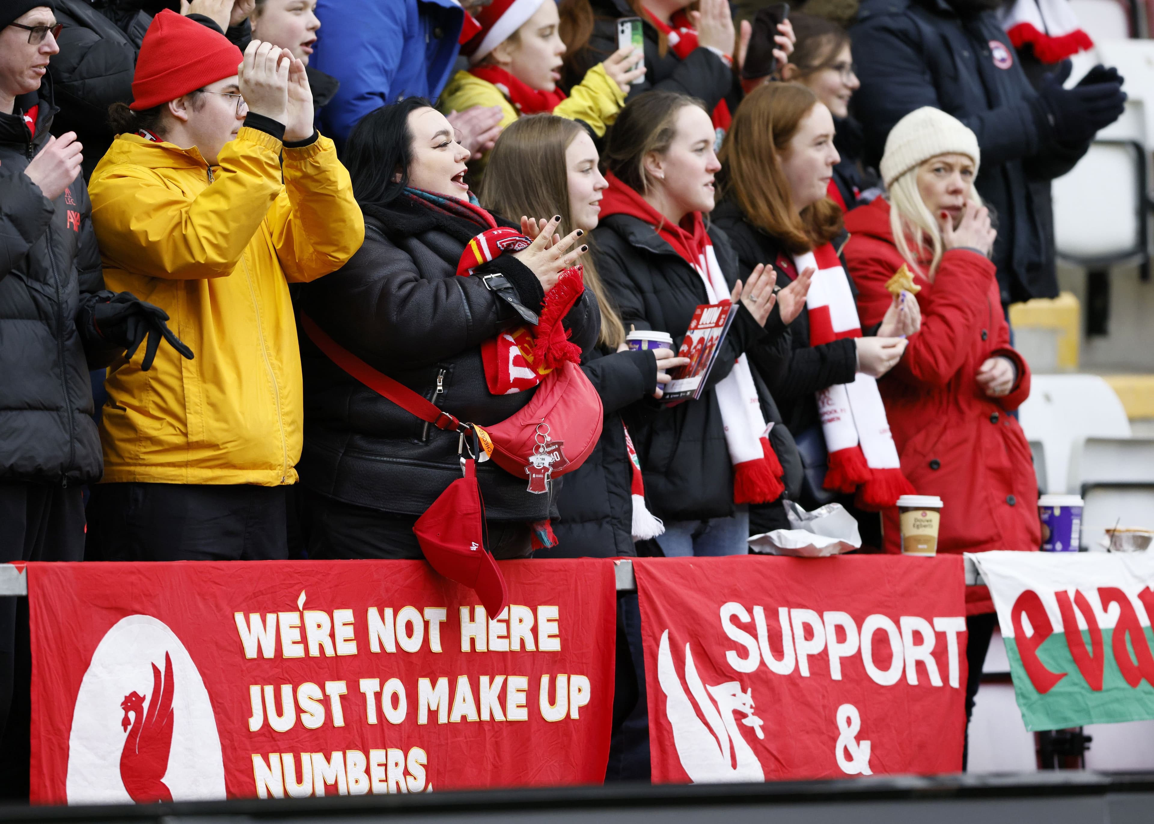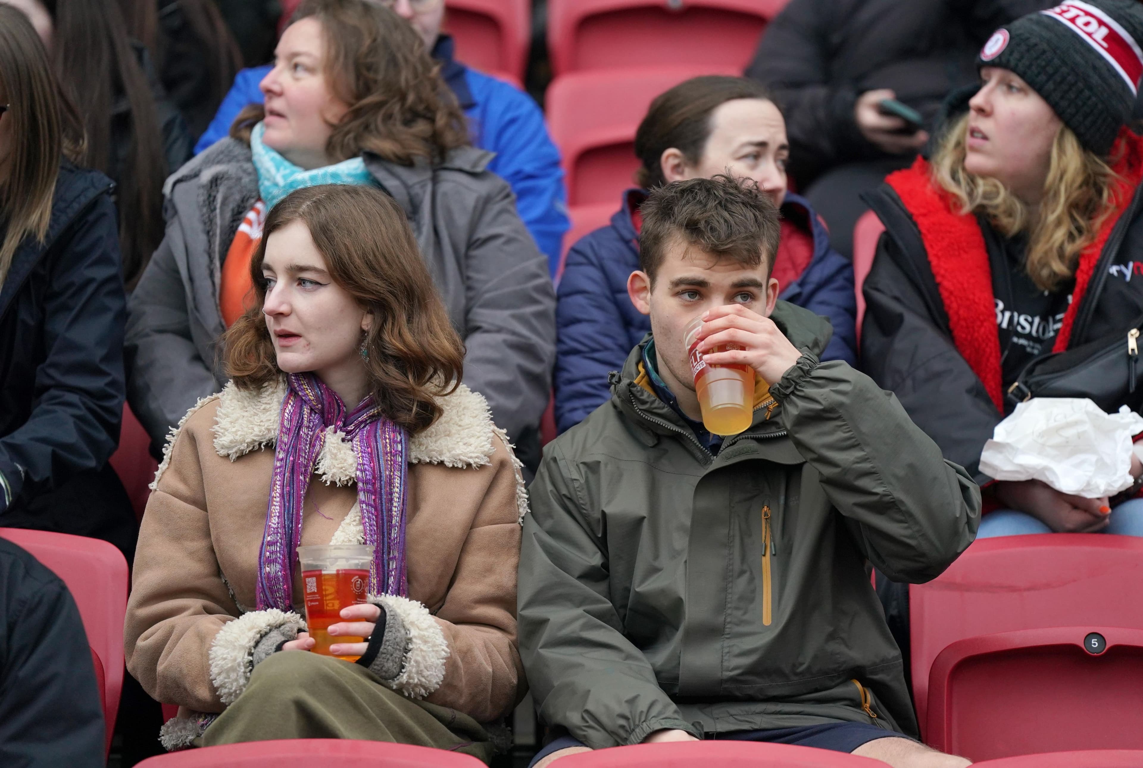 Fans drink beers in the stands at a Bristol City game in WSL2