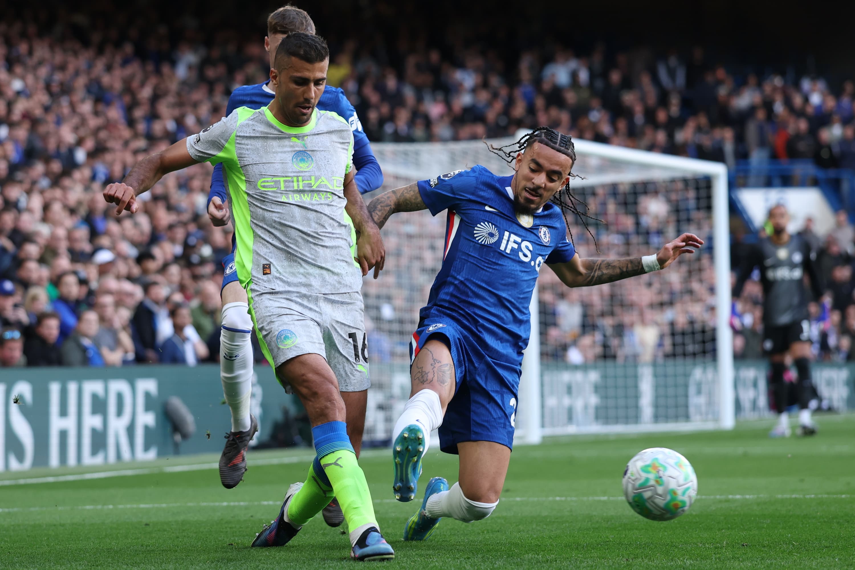Malo Gusto disputa un balón con Rodri en el Chelsea-Manchester CityAP