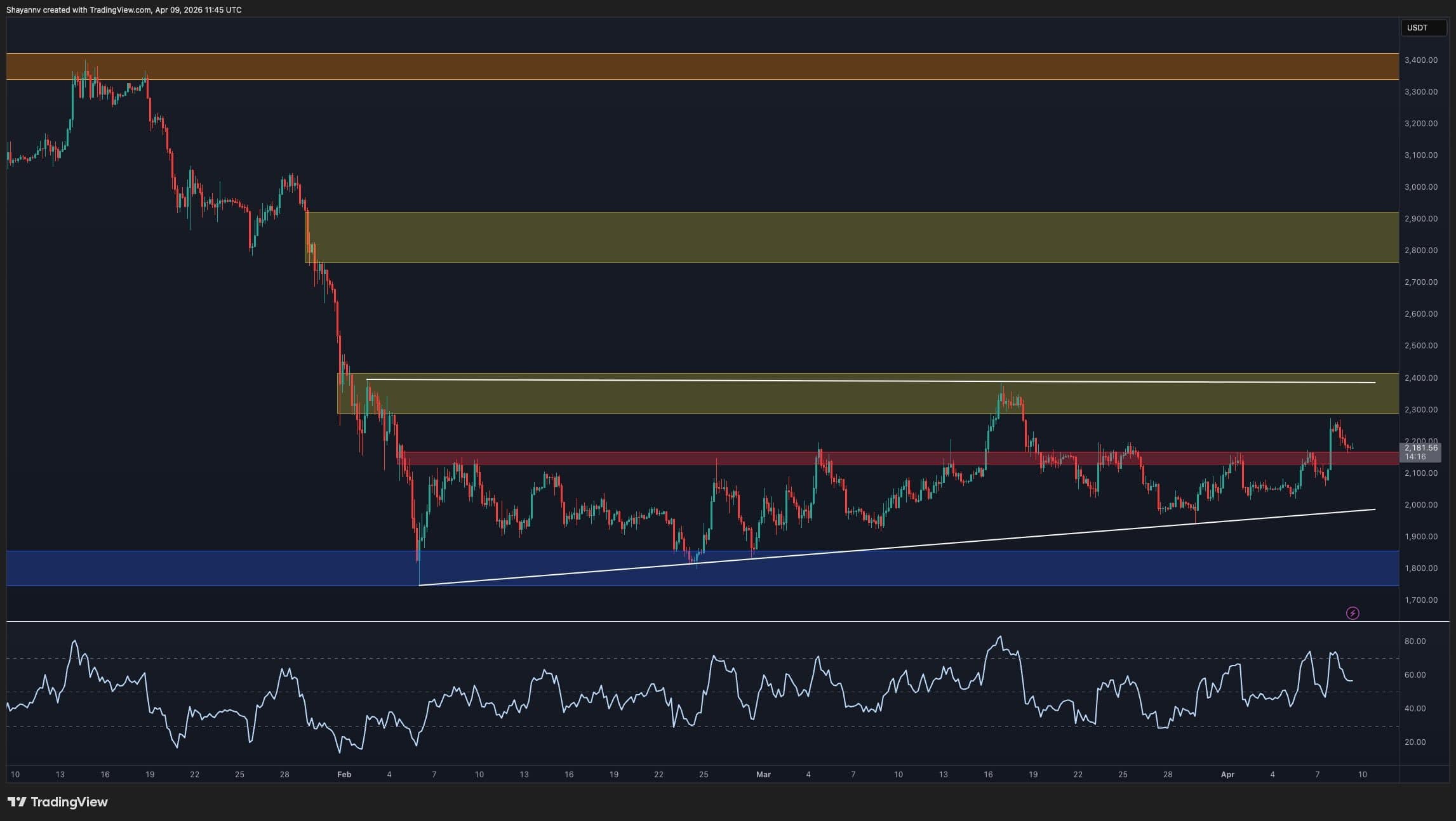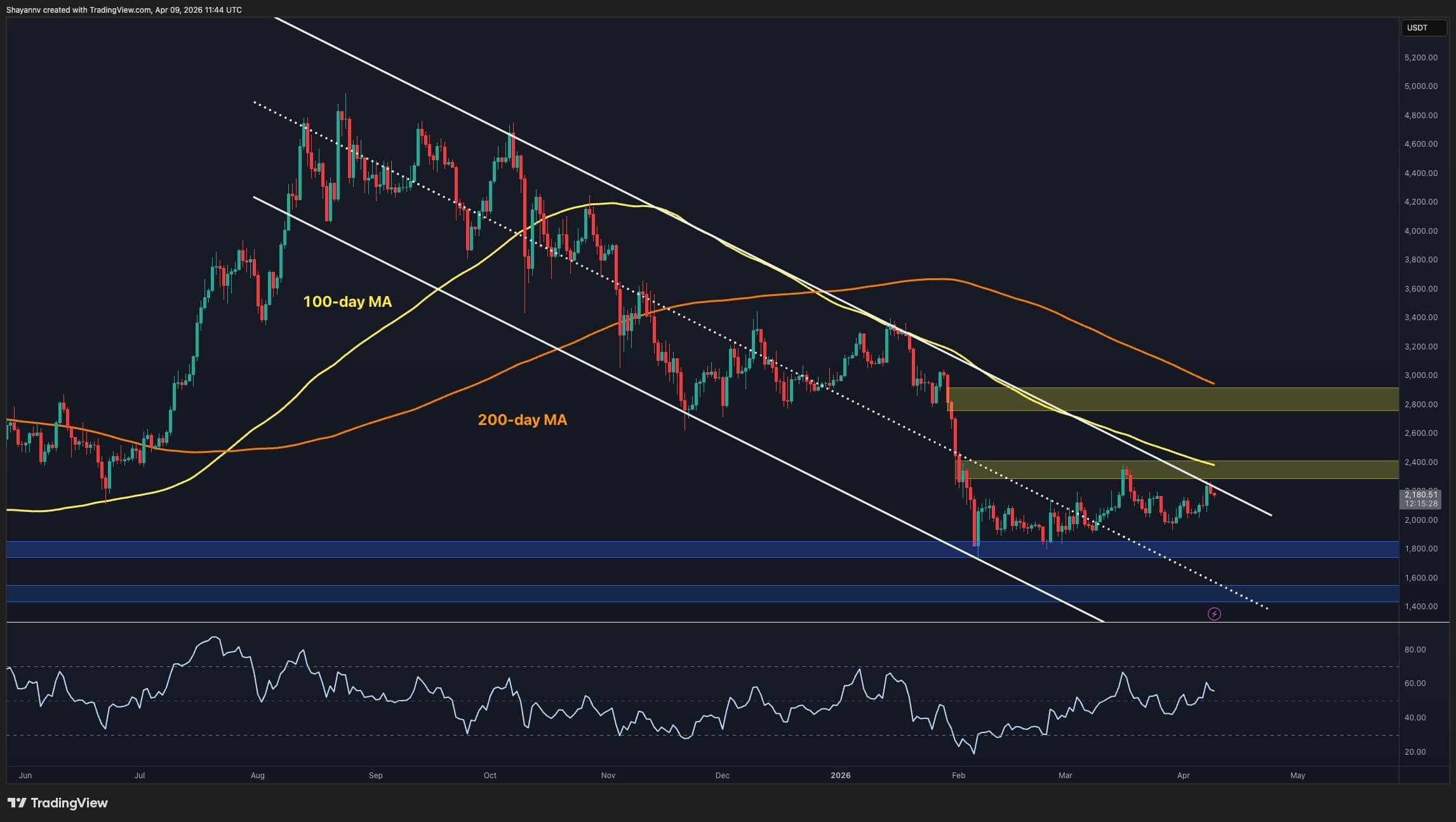 Current price sits just above the $2.15k short-term resistance-turned-support area. This level has served as a pivot zone over the past several weeks. Still, the $1.8k support band remains the most important level on the chart.