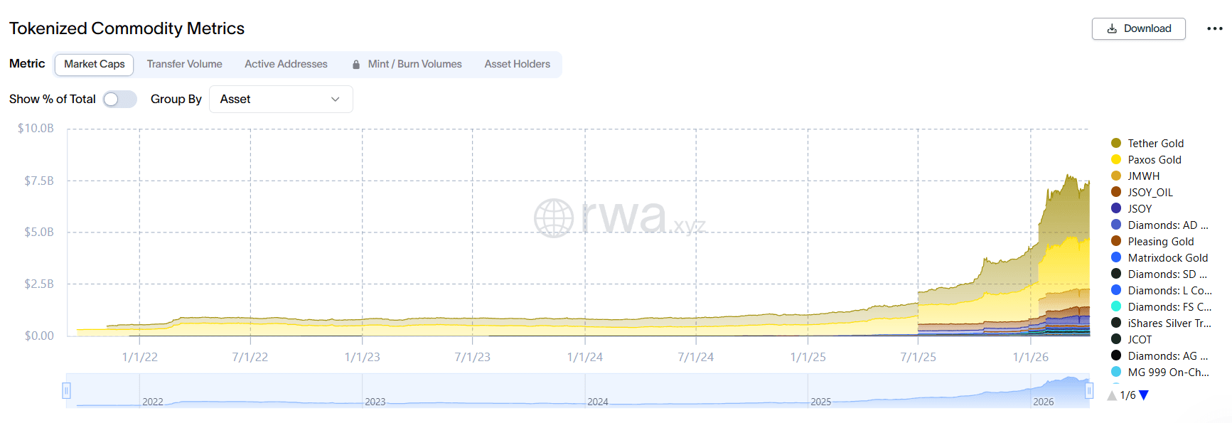 Tokenized commodities market capitalization. Source: RWA.xyz