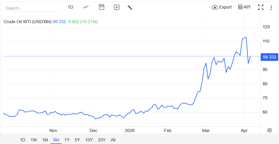 Brent crude oil has risen by around 44% since the first US/Israeli strikes on Iran on Feb. 28, from around $69 to above $99 at the time of writing, according to data from Trading Economics. Oil prices peaked at around $114 on Tuesday, their highest level since the beginning of the conflict.