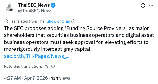 The proposed rules require that any financier supporting major shareholders of crypto companies must also obtain regulatory approval from the Thai SEC.