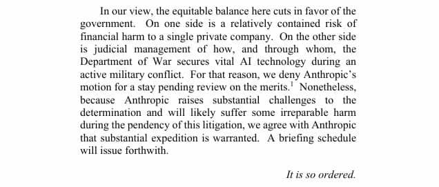 The ruling acknowledged that Anthropic will “likely suffer some degree of irreparable harm absent a stay,” and stated that “substantial expedition is warranted.”