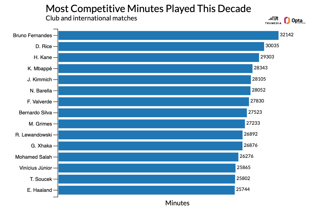 So, to review: Fernandes has played over 2,000 more competitive minutes than any other midfielder or attacker since 2020 -- that's nearly a full extra season of game time compared to second-place Declan Rice.