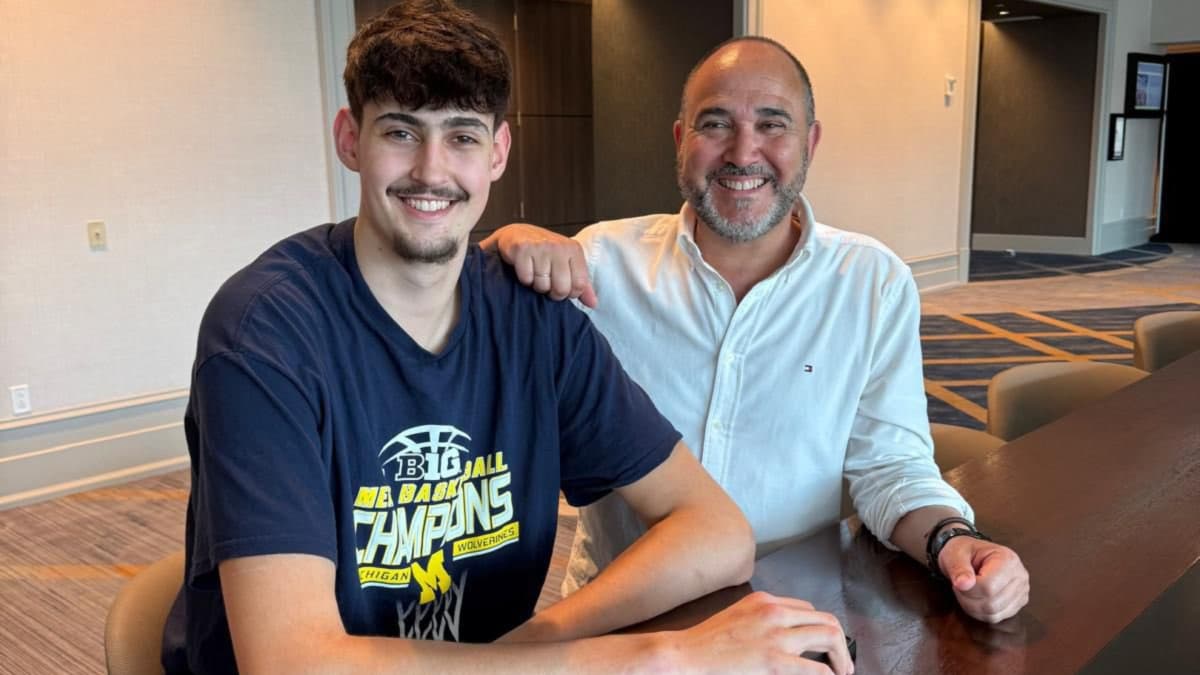 Mateo, junto a un cartel de la F4 con la sudadera de los Wolverines de Michigan.BasketFEB