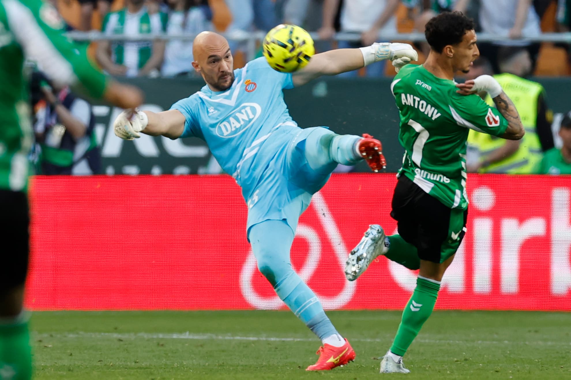 De nuevo Dmitrovic estuvo acertado para evitar una llegada de Antony. Y para completar su trilogía, el portero del conjunto perico, que vivió días complicados en la capital hispalense durante su etapa en el Sevilla, sacó con una gran mano abajo un remate llegando desde atrás de Altimira que se colaba. El Betis dominaba y llegaba con cierta comodidad a zonas de remate, pero le faltaba acierto para definir. Al mismo tiempo, el Espanyol se olvidaba de atacar y se centraba en cerrar espacios para llegar sin daños al descanso, algo que consiguió.