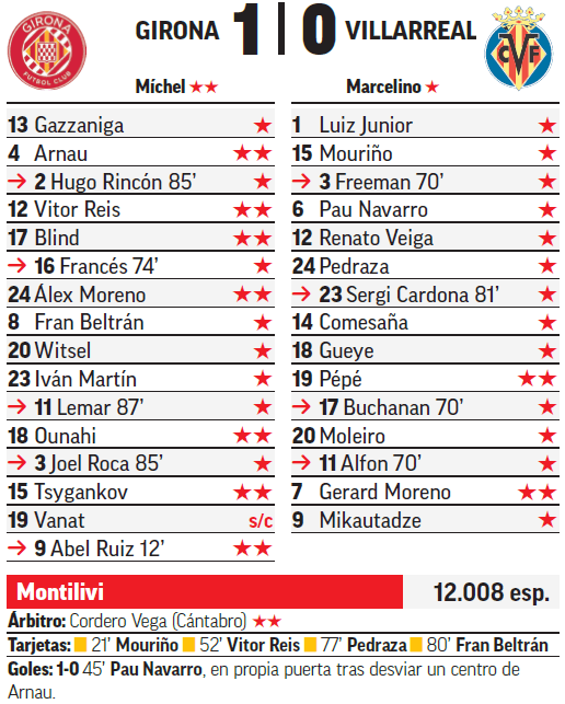 Girona won 1-0 thanks to an own goal by Pau Navarro just before halftime. The team controlled possession and used a pragmatic approach to wear Villarreal down. That was enough to secure the three points at Montilivi.