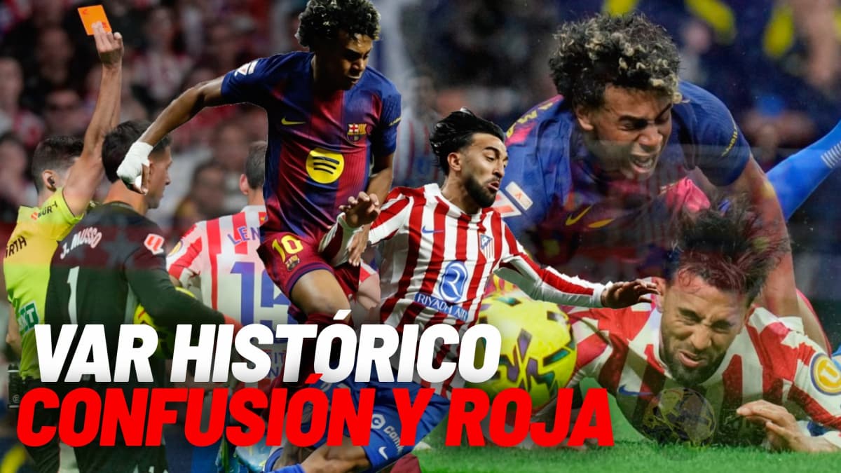en el añadido de la primera parte Mateo Busquets Ferrer mostró la roja directa a Nico González tras una acción con Lamine: "Se revisa en el VAR porque es una ocasión manifiesta de gol. Es una decisión correcta anular la amarilla y mostrar la roja al jugador del Atlético de Madrid", manifestó Pérez Burrull en el programa 'Marcador' de Radio MARCA.