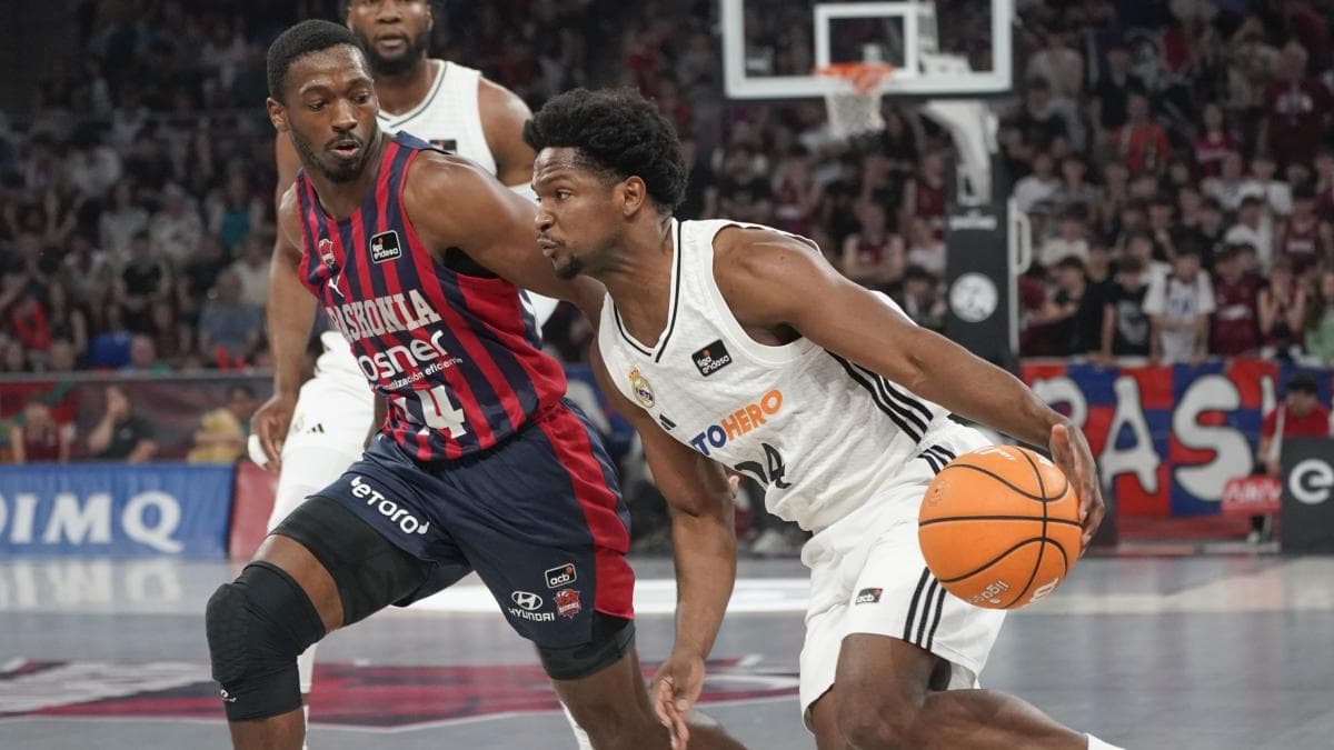 VITORIA, 06/06/2025.- El base dominicano del Real Madrid Andrés Feliz (d) intenta superar al base estadounidense del Baskonia Kamar Baldwin durante el segundo partido del playoff de cuartos de final de la Liga Endesa de baloncesto entre el Baskonia y el Real Madrid, este viernes en el Fernando Buesa Arena de Vitoria. EFE / L. RICO