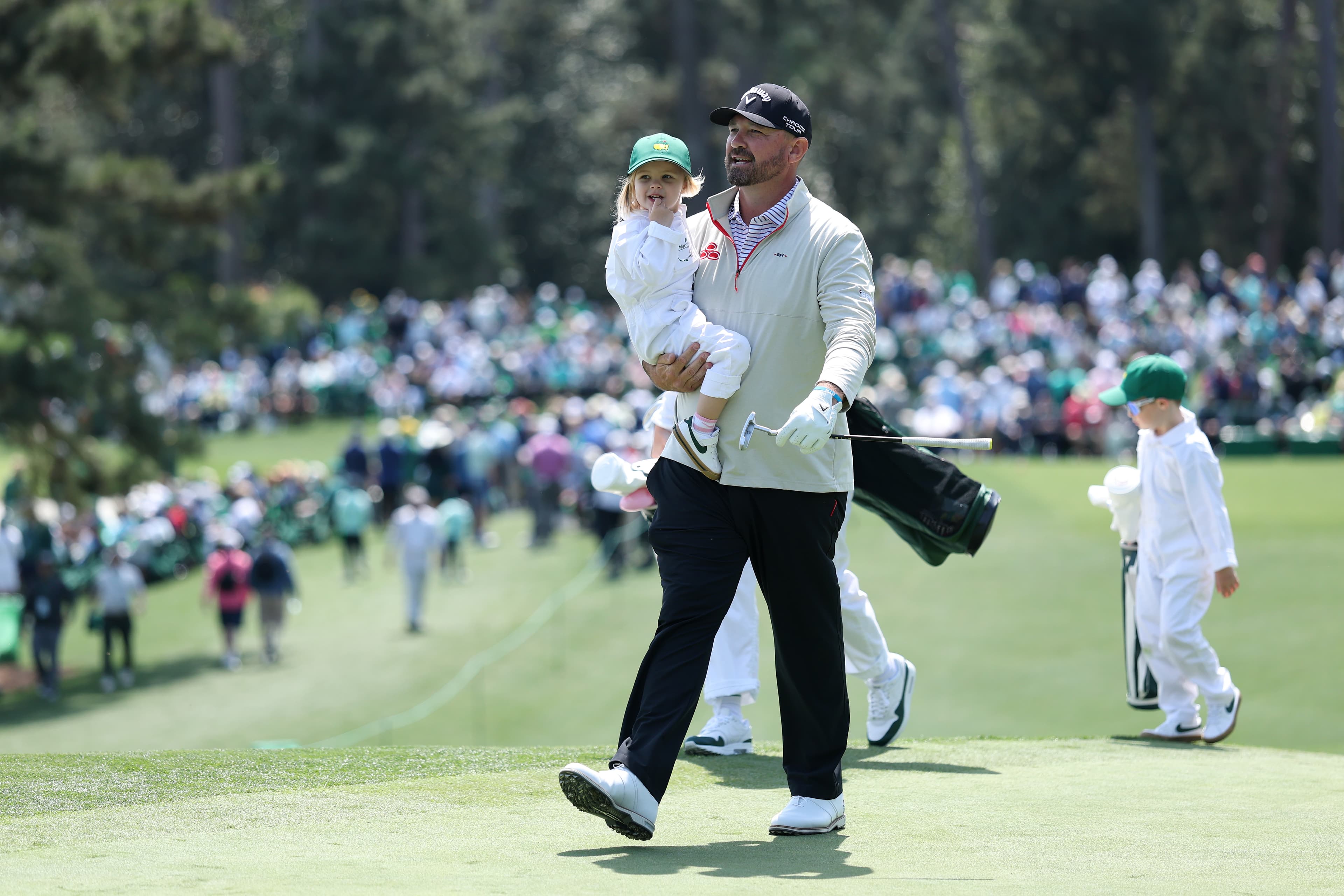 AUGUSTA, GEORGIA - APRIL 08: Amateur Brandon Holtz of the United States carries his daughter Millie Holtz across the second green during the Par Three Contest prior to the 2026 Masters Tournament at Augusta National Golf Club on April 08, 2026 in Augusta, Georgia. (Photo by Maddie Meyer/Getty Images) | Getty Images
