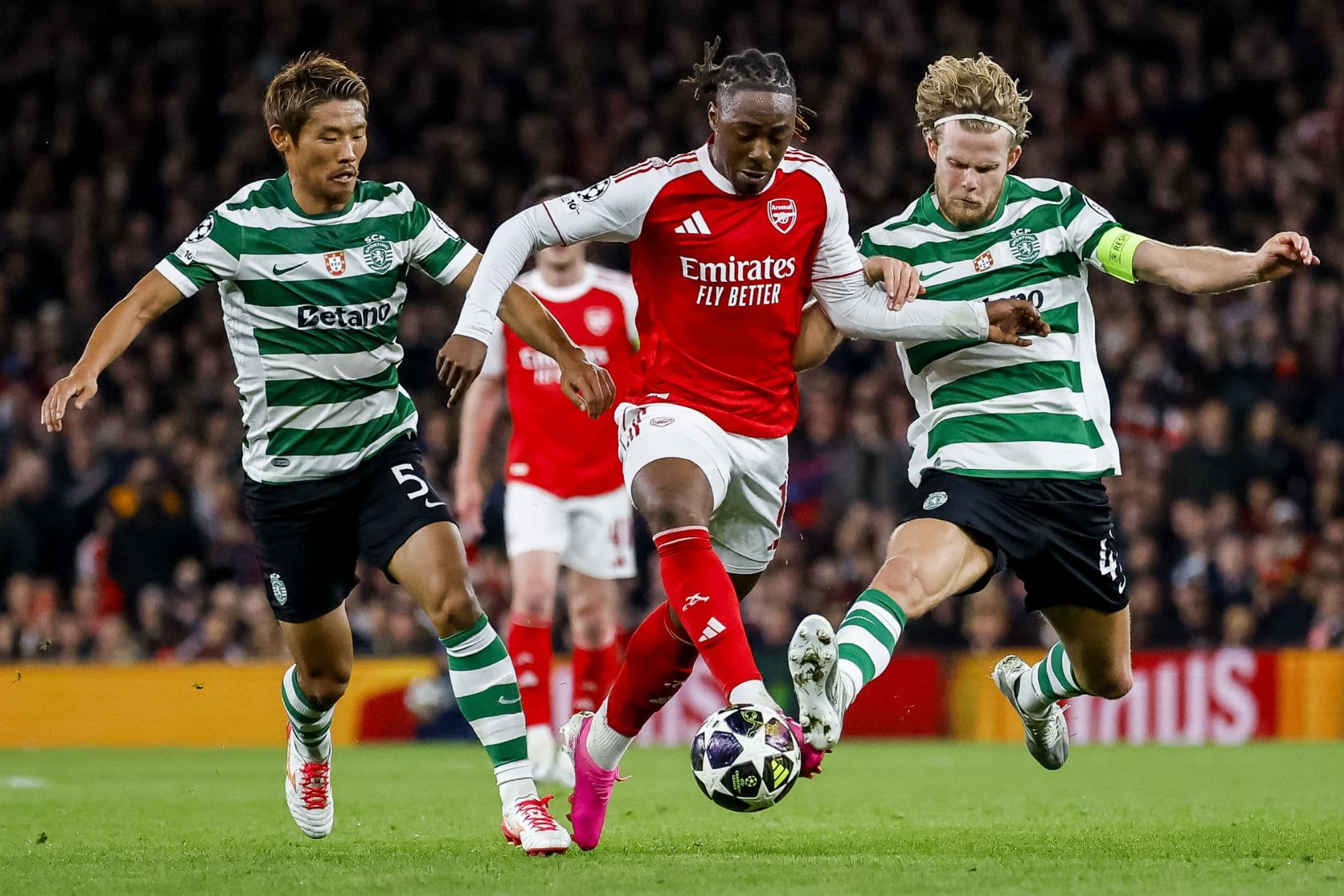 "History in our sights" (Historia en nuestro punto de mira) podía leerse en el tifo que desplegó uno de los fondos del Emirates. El ambiente era de noche grande y recibieron por todo lo alto a un Arsenal donde Arteta renovó los laterales con Mosquera e Hincapié, metió a Eze en la mediapunta y a Martinelli en izquierda. Rui Borges, por su parte, introdujo a Quaresma por el lesionado Fresneda (línea de tres asimétrica) y recuperaba a Hjulmand tras cumplir sanción.
