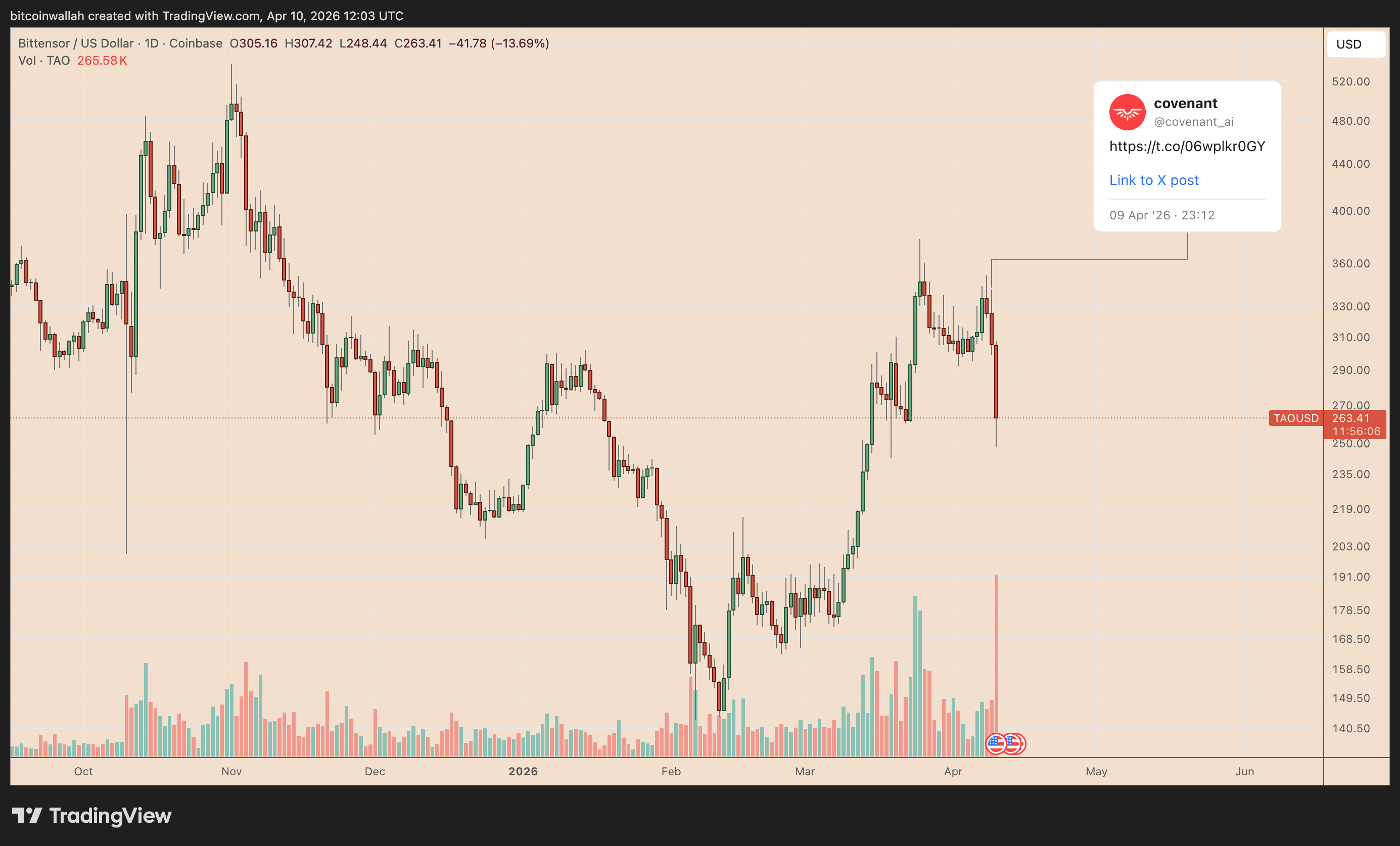 TAO’s price dropped by roughly 30% from its weekly high to around $249. A huge part of that downside came after Covenant AI accused Bittensor of running a “decentralized theater.”