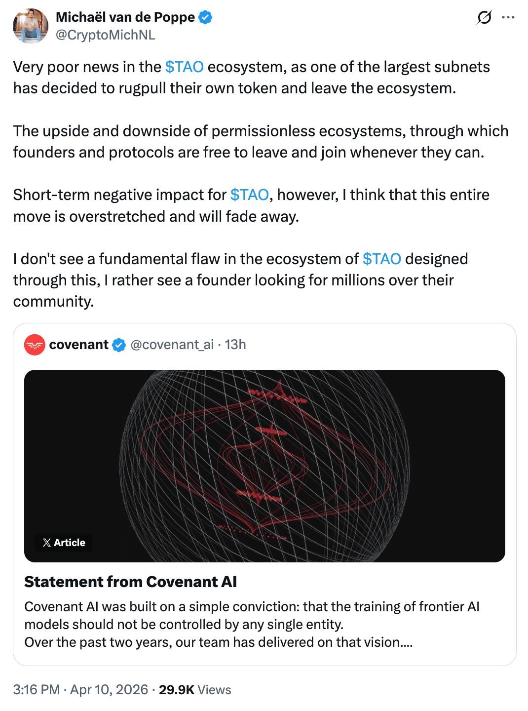 Bittensor’s TAO token may drop by up to 45% in the coming weeks as Covenant AI, one of its top subnet operators, publicly announced its full exit from the ecosystem.