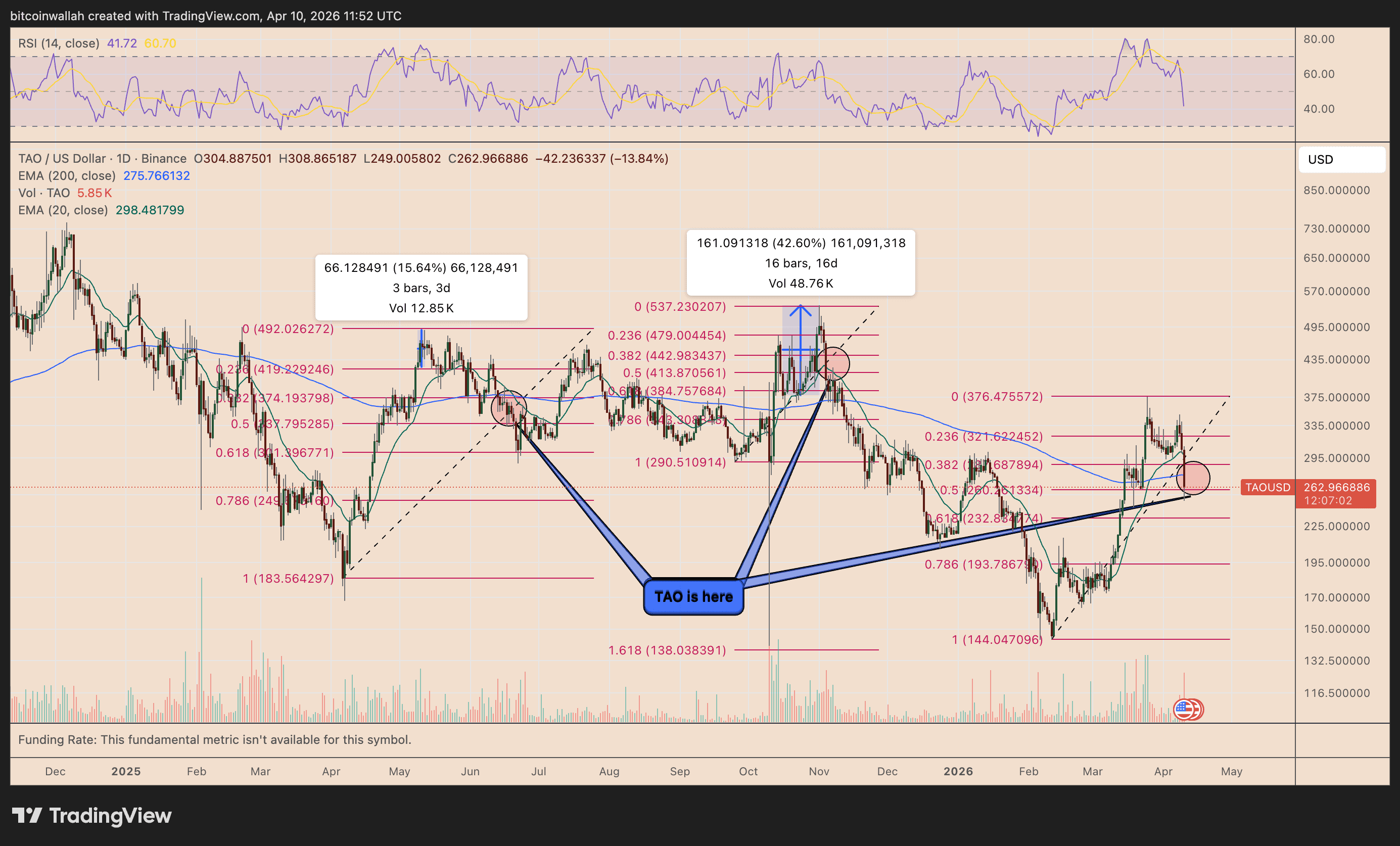 TAO is currently consolidating inside the 0.382–0.5 Fibonacci retracement range, a zone that has historically acted as a short-term consolidation area during TAO’s broader macro-top corrections.